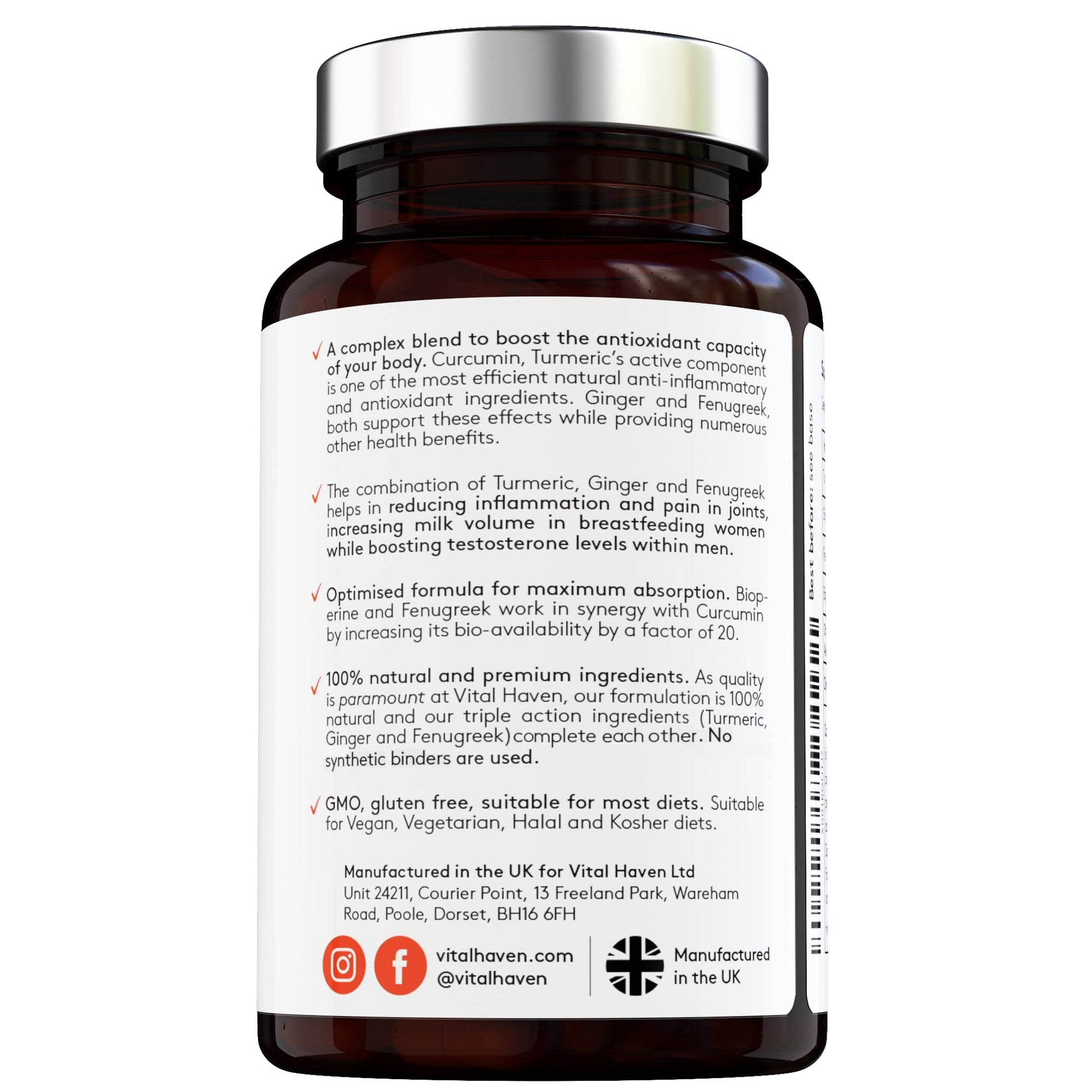 - ✔ VITAL HAVEN'S OPTIMISED FORMULA: the complex blend of Turmeric, Ginger and Fenugreek, combined with Bioperine to maximise absorption, allows you to fully benefit from the power of each ingredient.