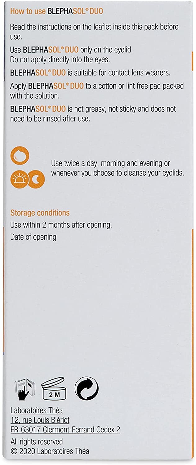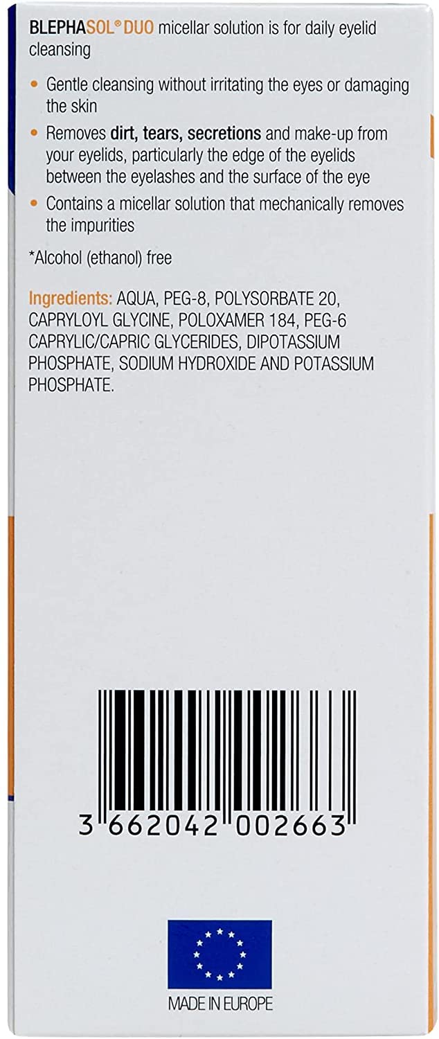 Blephasol Duo An aqueous cleansing solution for gentle cleansing of the eyelids and lashes, and has been specially formulated to be kind to both skin and eyes using a micellar solution. The 100ml bottle of Blephasol can be kept for up to two months once opened. Blephasol Blephasol is an aqueous solution for gentle cleansing of the eyelids and lashes, and has been specially formulated to be kind to both skin and eyes. The 100ml bottle of Blephasol can be kept for up to two months once opened. A small amount of the aqueous MICELLAR solution is applied to a cotton pad and gently wiped onto the eyelid and lash area to remove debris and lifts away excess grease without rubbing ? this unique cleansing action of Blephasol will even remove eye make-up, including waterproof mascara and eyeliner. Blephasol Duo features and benefits: NO soap, perfumes, parabens or alcohol NO preservatives MICELLAR solution Economical ? only a small amount needed each time Easy to use ? no rinsing required Tested by dermatologists and ophthalmologists Suitable for sensitive eyes Added convenience of 100 pads included (Same material as in Blephaclean wipes (lint-free)) Contact us 1:26:26More Info