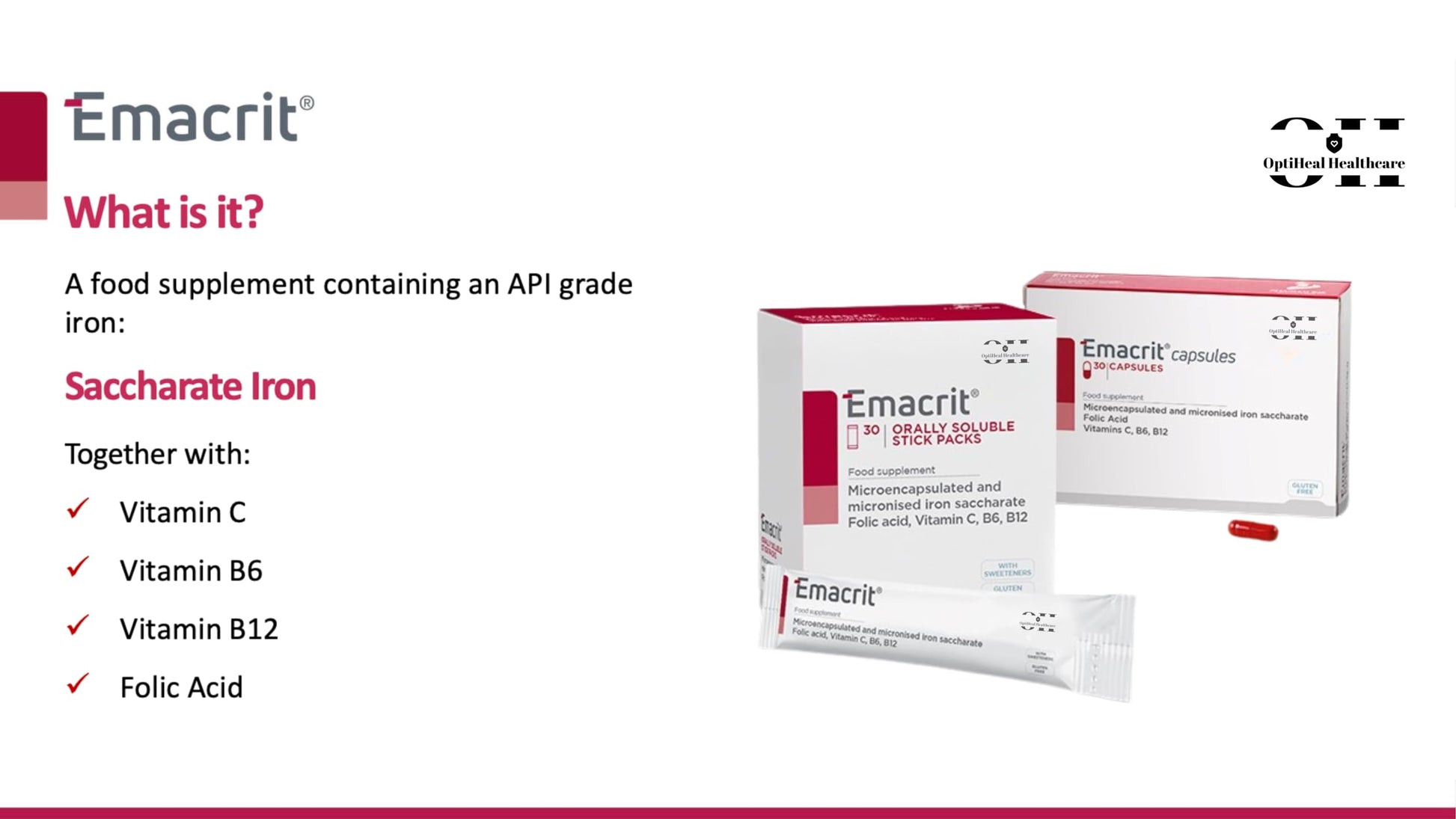 EMACRIT THE NEXT GEN OF IRON DEFICIENCY (Anaemia) IS HERE! Cutting-edge science has helped us design the next generation Iron supplement made GMO-Free and Gluten-Free to support mankind. The new MICRO-IONISED and MICRO-ENCAPSULATED Iron Saccharate in combination with Folic Acid, Vitamin C, Vitamin B6 and Vitamin B12. This next-gen product is designed by our team of Clinical Nutritionists, Biochemistry & Pharmacology experts, and manufactured under the highest standards of Quality by our EUROPEAN (Italy) manufacturing plants. Opti-Heal HC aims to bridge the gap between the unmet need within our society by providing food supplements to help those wretain a balanced nutritional intake. Our goal is to provide you with multi-benefits in 1 tablet. Nobody enjoys taking many tablets. We hope you do not need our product, however we make it in case you do need it. That's why we have included other vitamins and nutrients, to support the immune system and kidney function. Iron Deficiency or Anaemia (sometimes spelt Anemia), is a condition that affects a large portion of humans, it is characterised by reduced levels of energy on extended periods of time (at least weeks). Our Mechanism of Action is UNIQUE - Our MICRO-IONISED MICRO-ENCAPSULATED IRON passes the stomach withour releasing the Iron - When reaches the inner-gut (Duodenum), starts releasing Iron slowly - Iron is then absorbed directly by enterocytes - Iron gets mobilised into the bloodstreamMore Info