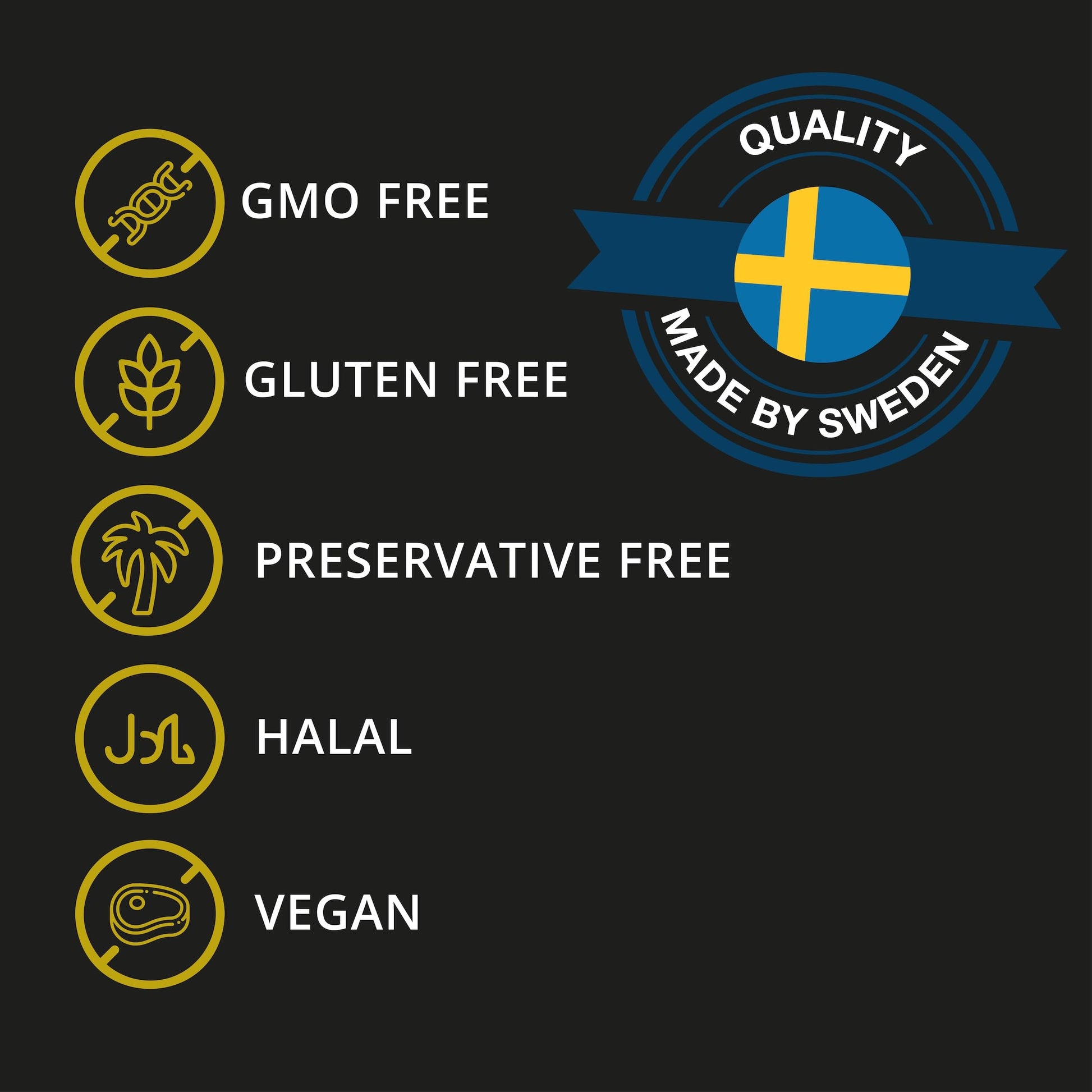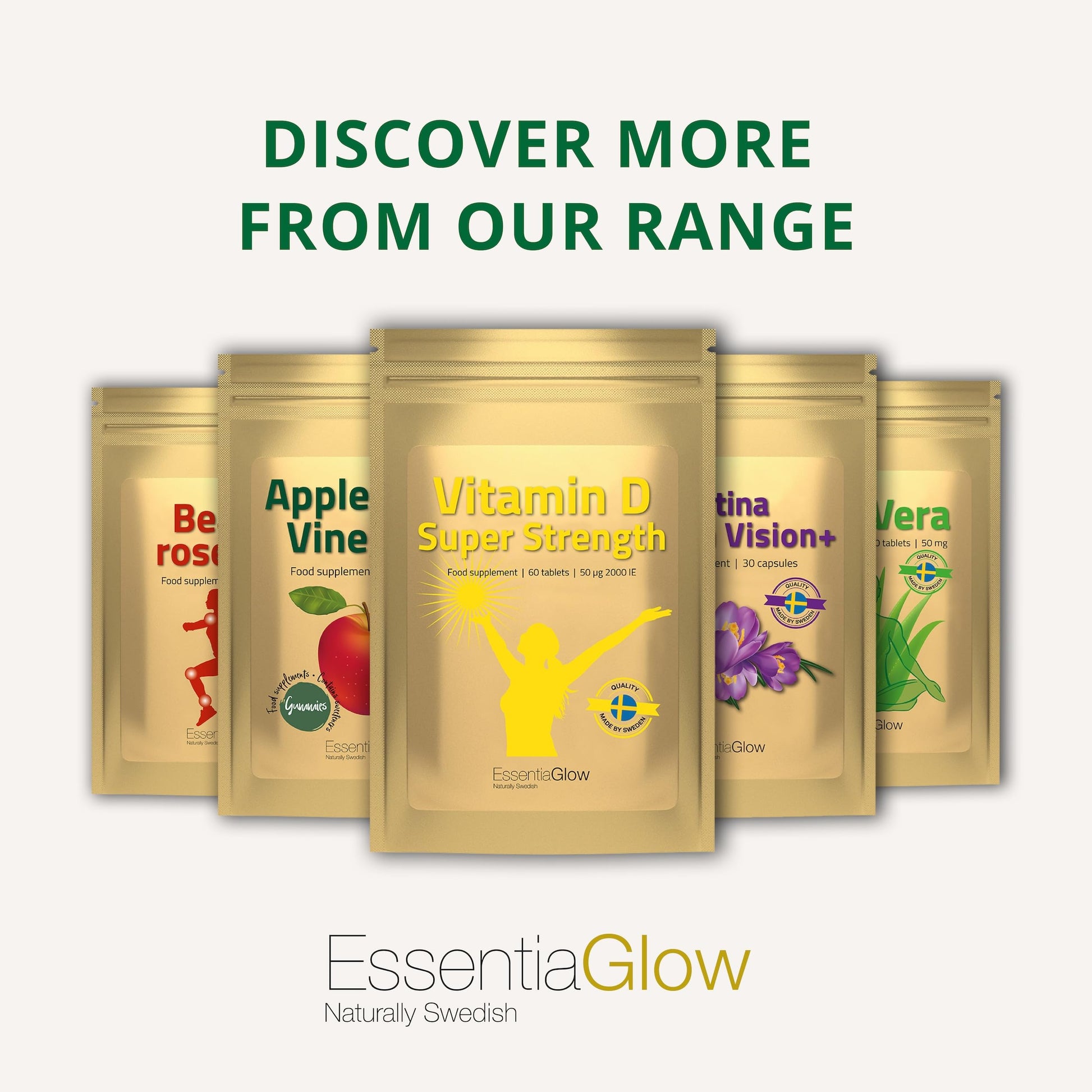 We started ESSENTIAGLOW 20 years ago with a simple idea: let’s build a Swedish company we’d love to be a customer of. Let’s dedicate ourselves to helping people improve their health and wellbeing and get the best out of life. Let’s sell premium quality, affordable products that can work individually or together to support the immune system, good digestion, and energy levels, that help to regulate sleep, and optimise brain, heart, eye, skin and joint health. So that’s what we did.Vitamin D is an essential nutrient that is crucial for overall health and wellbeing. It plays a vital role in helping the body absorb calcium and maintaining strong, healthy bones. It is also linked to improved immune and cognitive function. Our main sources of vitamin D are foods such as oily fish, egg yolks and red meat, and sunlight. But many people don't get enough vitamin D from sunlight and diet alone, especially during the winter months, so taking a daily supplement can help ensure that you maintain optimal amounts of this vital nutrient. This supplement is free from artificial flavours and preservatives, colourants, wheat, fish, gluten, peanuts/nuts, palm oil, lactose, mustard, sesame and sugar. Non-GM, vegetarian, vegan, Kosher, Halal.