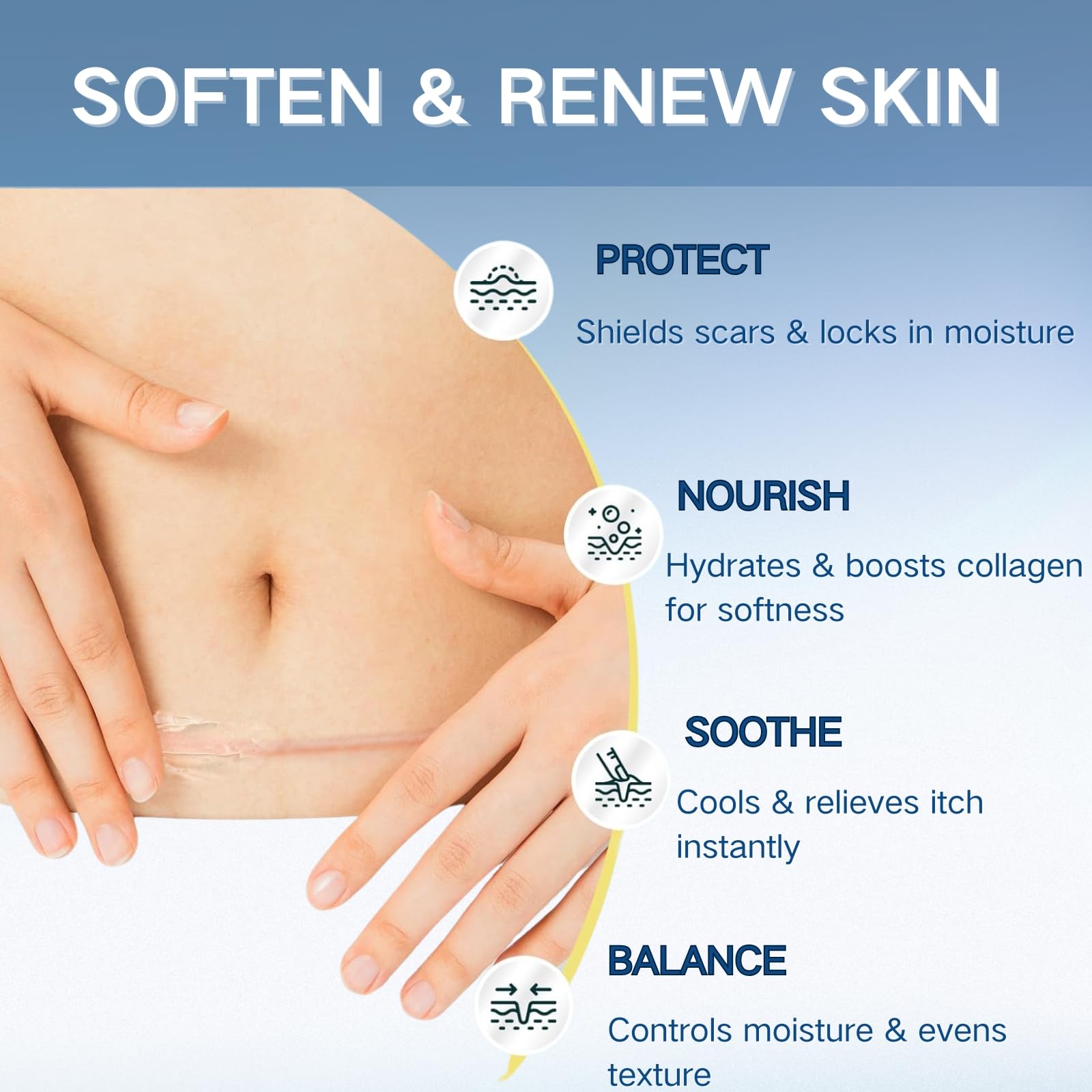 Gentle enough for facial use (scar cream for face) and delicate zones like the abdomen (ideal as a pregnancy stretch mark cream).