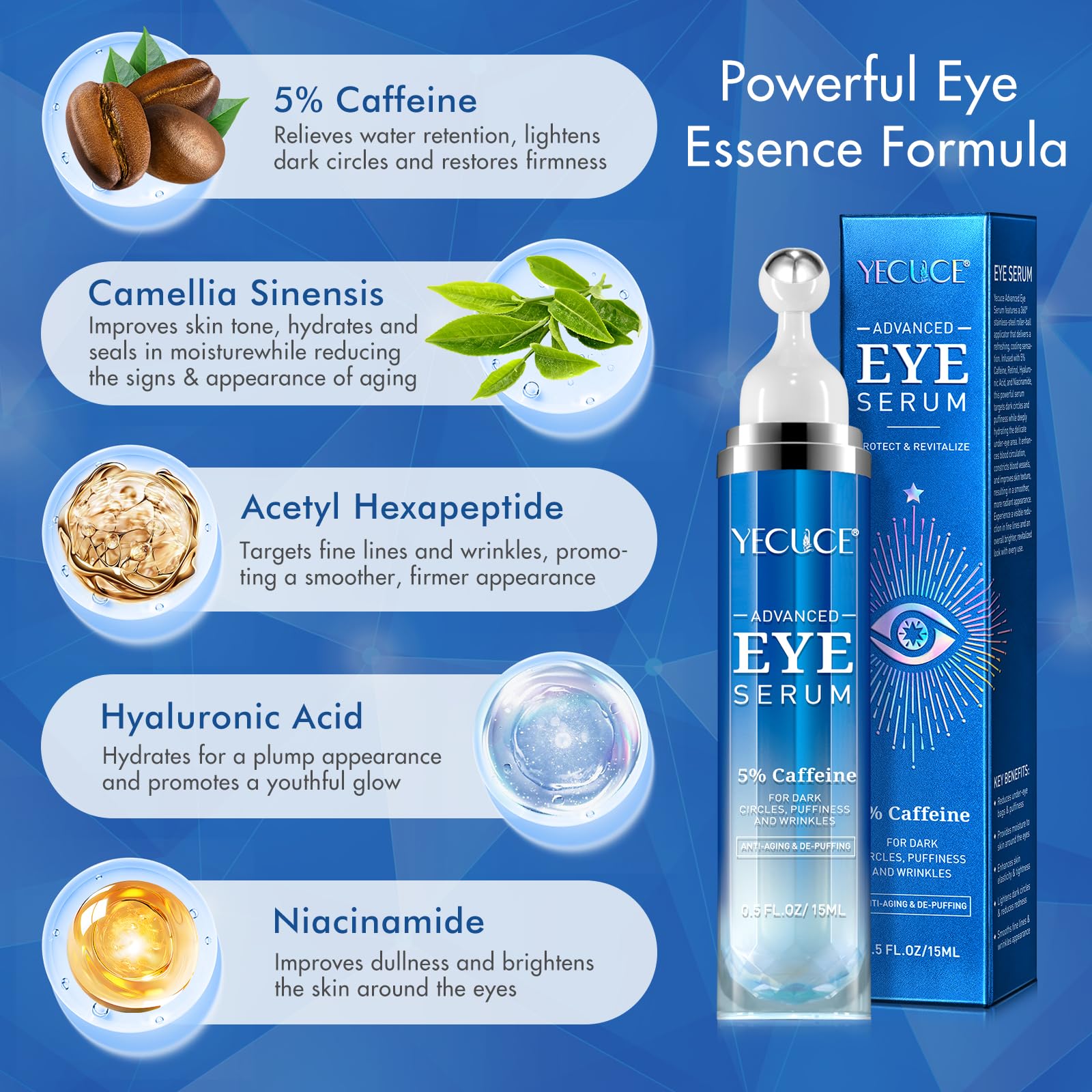5% Caffeine Eye Cream Anti Aging - Eye Serum for Dark Circles and Puffiness, with Retinol Hyaluronic Acid Niacinamide, Under Eye Cream for Eye Bags Treatment with 360° Eye Roller Ball for Women & Men