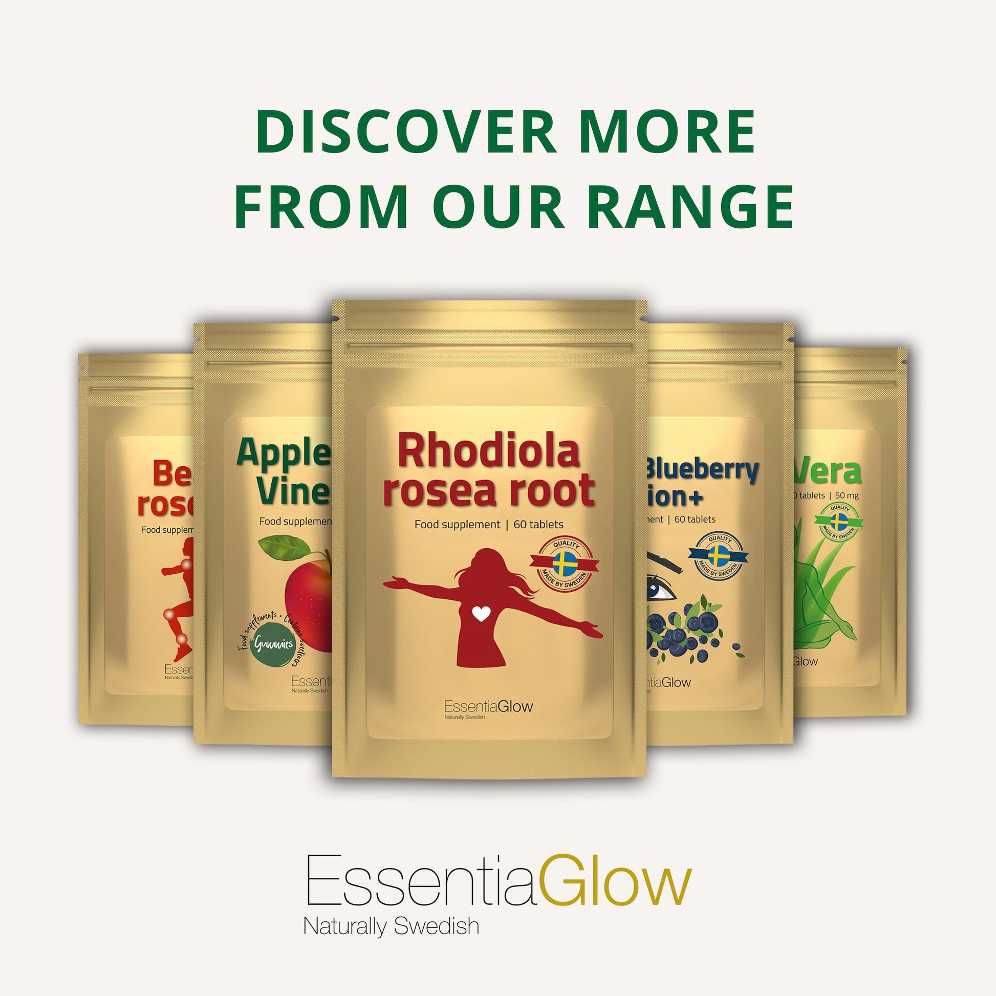 We started ESSENTIAGLOW 20 years ago with a simple idea: let’s build a Swedish company we’d love to be a customer of. Let’s dedicate ourselves to helping people improve their health and wellbeing and get the best out of life. Let’s sell premium quality, affordable products that can work individually or together to support the immune system, good digestion, and energy levels, that help to regulate sleep, and optimise brain, heart, eye, skin and joint health. So that’s what we did.Rhodiola rosea is a hardy herb found mainly in Arctic environments and at high altitudes in Europe, Asia and North America. Rhodiola is often called golden root, Arctic root or rose root, and is known as an adaptogen, a type of plant believed to help the body better adapt to and cope with mental and physical stress. It also has powerful antioxidant qualities which fight free radicals, the unstable atoms that can damage cells, cause disease and accelerate ageing. Rhodiola has been used as a traditional herbal medicine by many cultures over the years to counteract tiredness, boost mood, and treat a range of age-related ailments. This supplement is free from nuts, soy, salt, gluten, yeast, palm oil, artificial flavours and preservatives; Non GMO, vegetarian, vegan, Kosher, Halal.