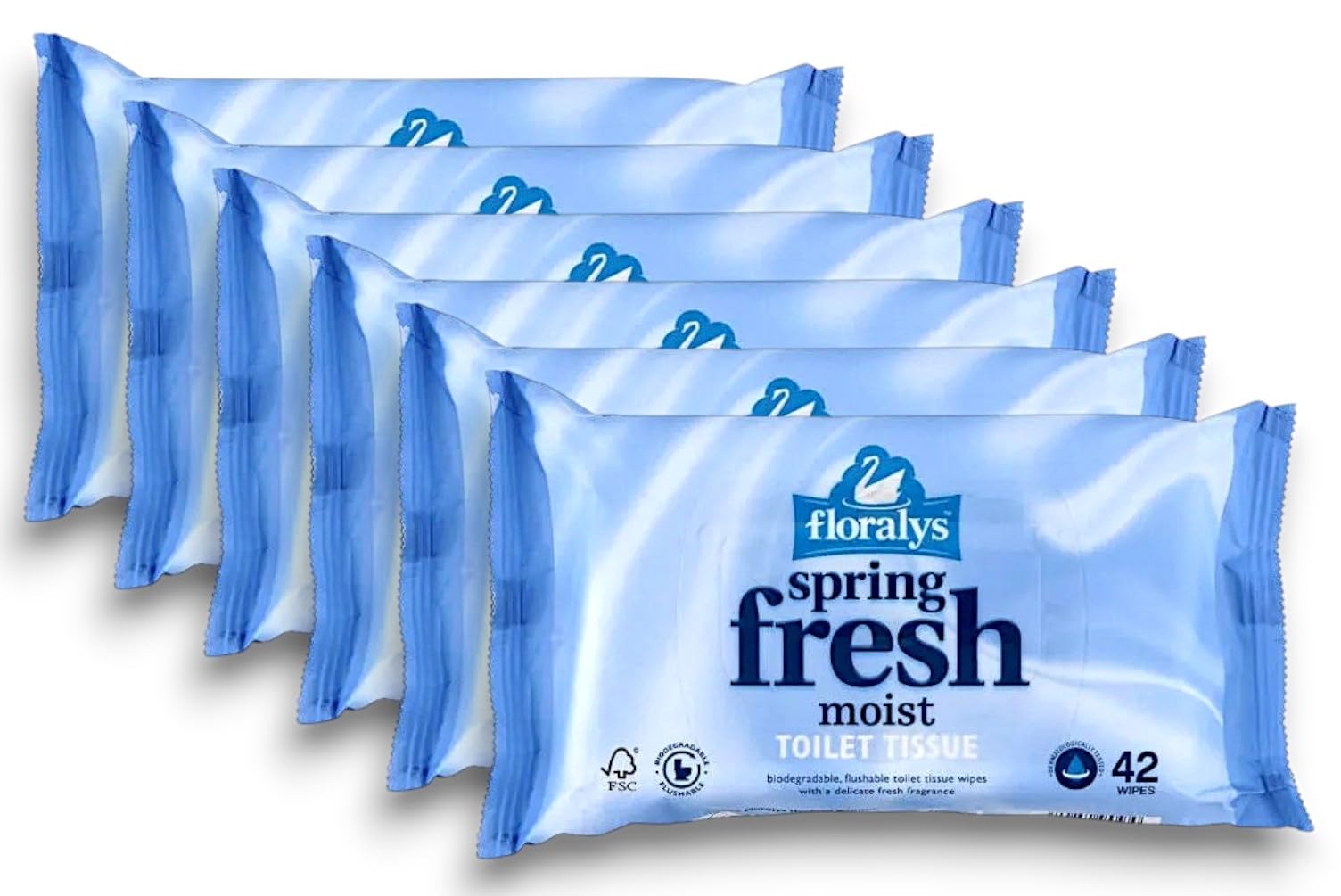 6x Floralys - Aldi | Spring Fresh - Moist Toilet Tissue | 42 Wipes per Pack [Six Pack] Spring Fresh Toilet Tissues Are The Perfect Accompaniment to Regular Toilet Tissue, They Gently Cleanses The Skin Leaving It Feeling Cleaner & Fresher. For Best Results, Flush 1-2 Wipes At A Time.More Info