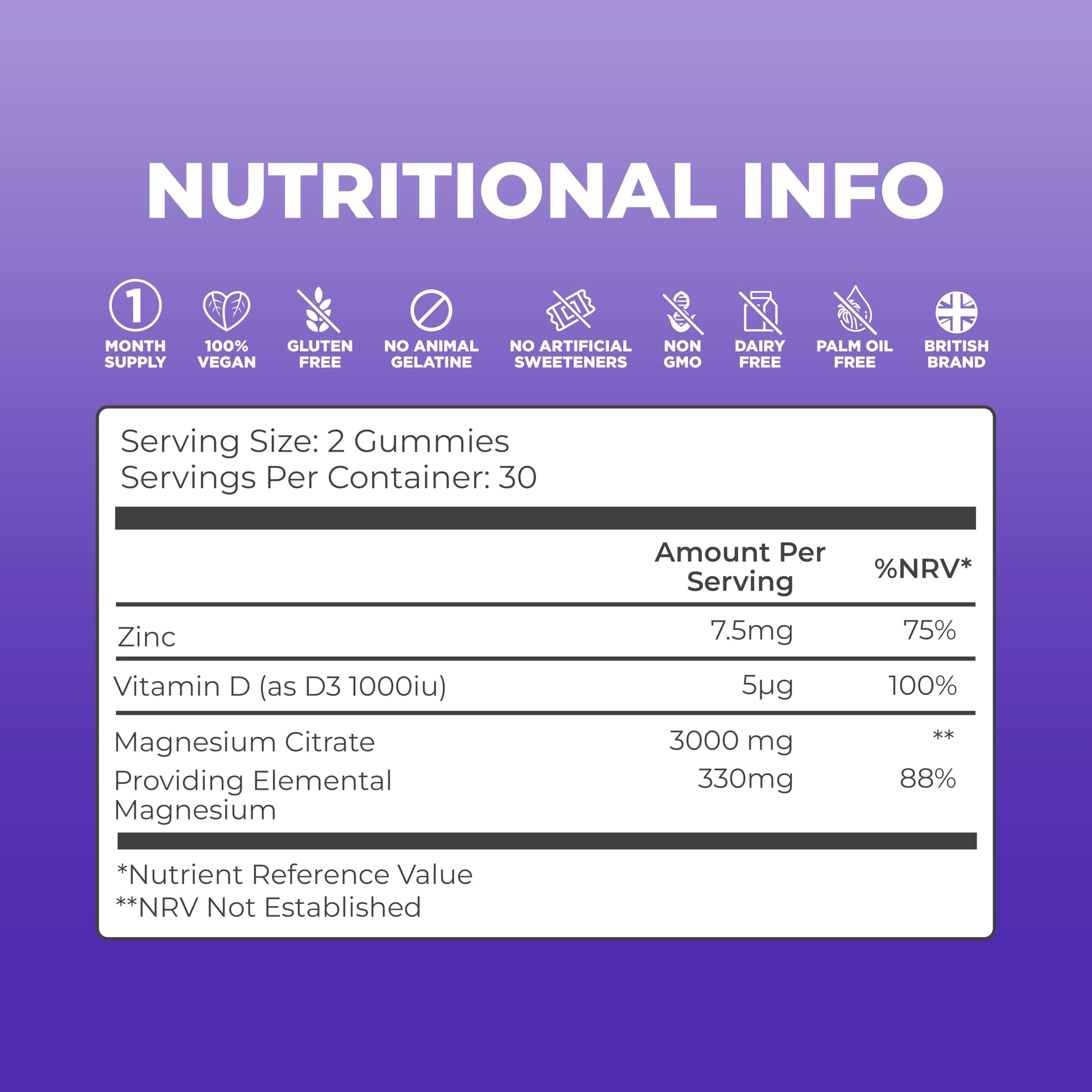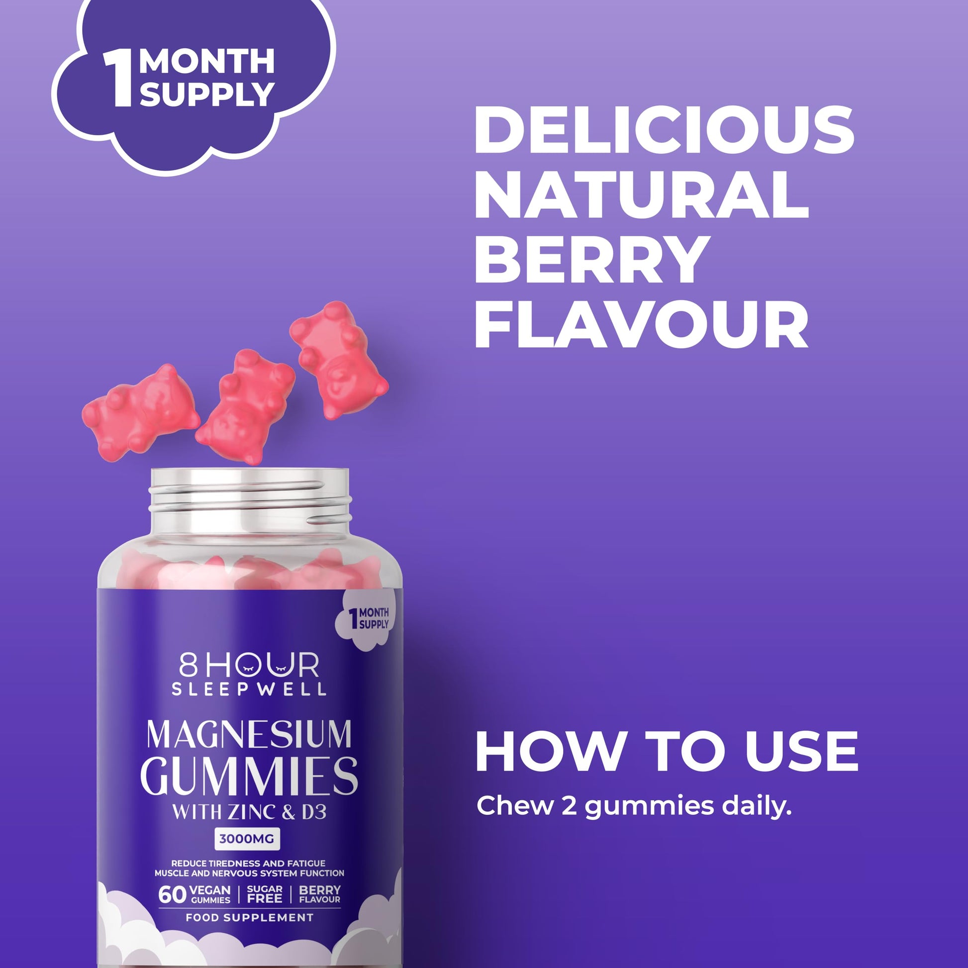 8 Hour Sleepwell 60 Vegan Chewable Magnesium Gummies for Adults -3000mg High Strength - Magnesium Citrate, Zinc & Vitamin D3-330mg Elemental Magnesium for Sleep, Muscle & Bone Support - by 8 HOUR SLEEPWELL