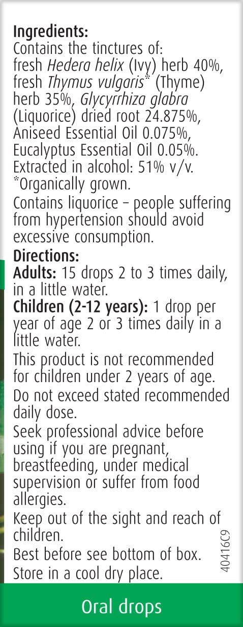 Fresh Herb Extracts Organically Grown Unique Combination Created By Alfred Vogel Thyme Has Been Used Through The Ages By Many Different Cultures. The Egyptians Used It For Embalming, The Ancient Greeks Put It In Their Baths And Used It As Incense In Their Temples, And In The Middle Ages The Europeans Believed That By Putting It Under Their Pillows They Would Have A Sounder, Nightmare Free Sleep. Of Course Nowadays It Is Used In Cooking All Round The World And Is Also Used As A Herbal Remedy For A Number Of Conditions. Liquorice Is Recognised As A Tasty Treat. It Is Part Of Many Eastern Dishes, Drinks And Sweets And Has Been Used Traditionally In Both Chinese And European Medicine. Food Supplementfood Supplements Should Not Be Used As A Substitute For A Varied And Balanced Diet And A Healthy Lifestyle. Avoid During Pregnancy Or If Breastfeeding.Keep Out Of Reach And Sight Of Children. Directions: Adults: 15 Drops In A Little Water, 2 To 3 Times Daily.Children 2 12 Years : 1 Drop Per Year Of Age 2 Or 3 Times Daily In A Little Water.This Product Is Not Recommended For Children Under 2 Years Of Age.Do Not Exceed Stated Recommended Daily Dose. Ingredients: Contains The Tinctures Of: Fresh Hedera Helix Ivy Herb 40 , Fresh Thymus Vulgaris Thyme Herb 35 , Glycyrrhiza Glabra Liquorice Dried Root 24.875 , Aniseed Essential Oil 0.075 , Eucalyptus Essential Oil 0.05 . Extracted In Alcohol: 51 V V. Organically Grown. Looking For Our Products In A Store Near You Not Sure Whether Your Favourite Health Food Store Sells Our Products To Find Your Local Independent Store Selling Our Products, Just Type Your Postcode Below.More Info