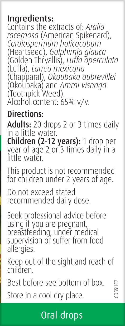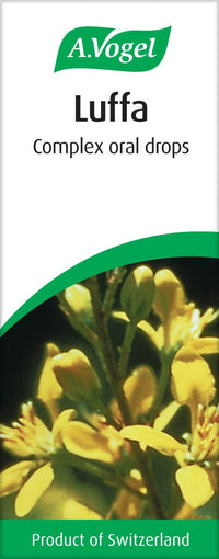 - 7 TROPICAL HERBS: A.Vogel Luffa Complex Drops contains the extracts of Aralia racemosa (American Spikenard), Cardiospermum halicacabum (Heartseed), Galphimia glauca (Golden Thryallis), Luffa operculata (Luffa), Larrea mexicana (Chapparal), Okoubaka aubre villei (Okoubaka) and Ammi visnaga (Toothpick Weed).