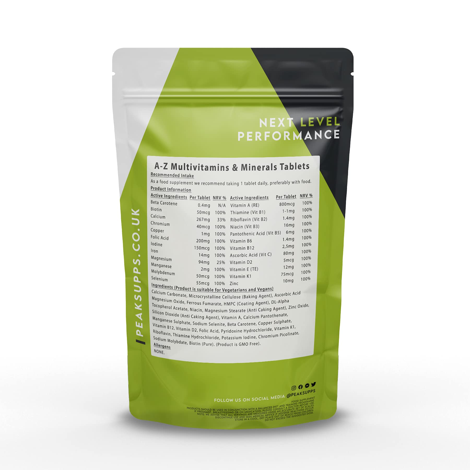 A-Z Multi Vitamins are a great way to boost your vitamin and mineral intake and cover any potential deficiencies in Vitamins & Minerals that your diet is not providing. Supplementing with our high quality multivitamin can support and improve general health and well being. Our Multivitamins can provide you with Vitamins & Minerals that your body may be lacking due to improper nutrition. Vitamins work together to regulate metabolism, support physiological processes and are extremely important for athletes/fitness enthusiasts. Different Vitamin groups play different roles in the body.Peak Supps A-Z Multivitamins benefits:-