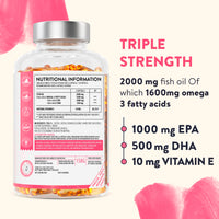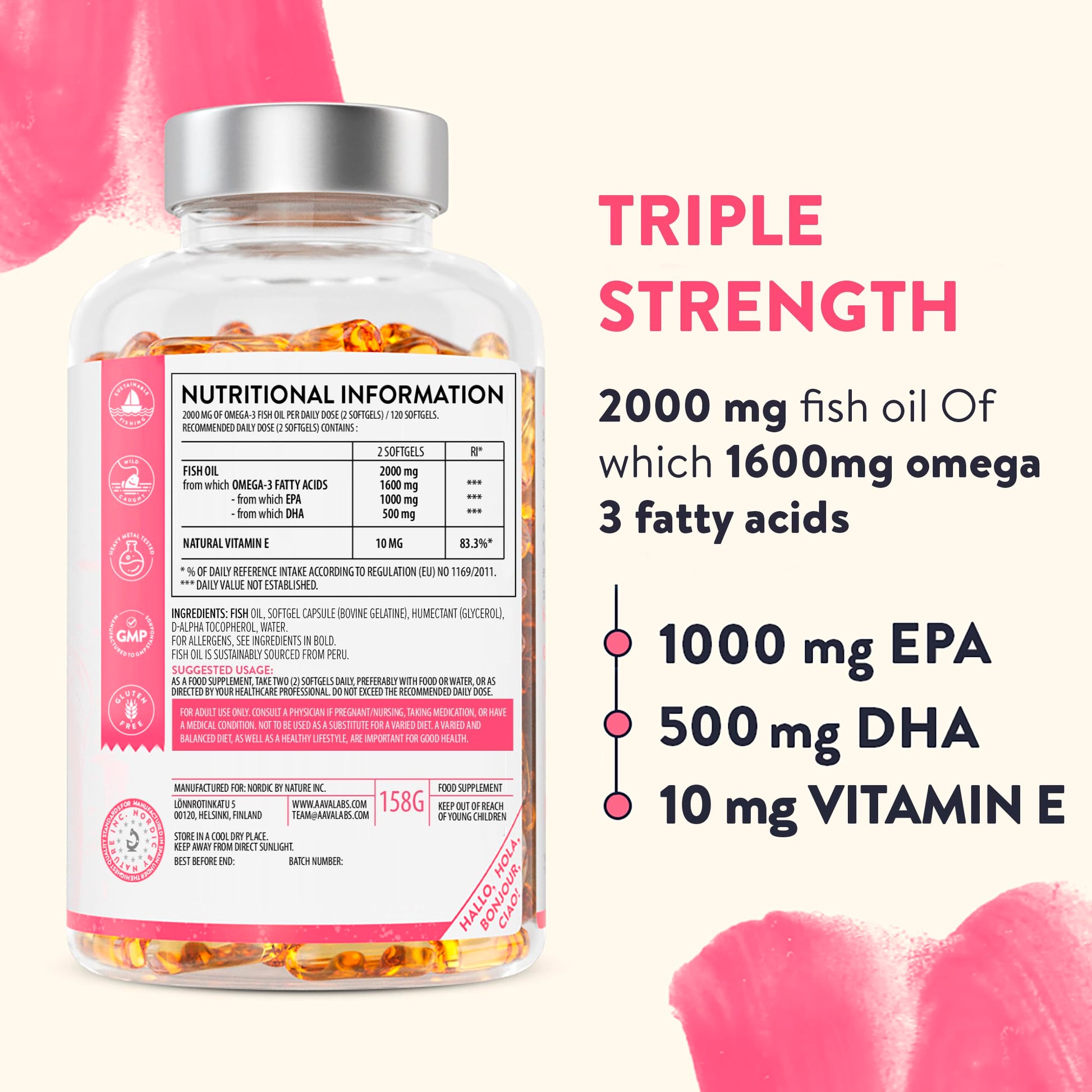 The recommended daily intake of 2 softgels a day provides you with 1000 mg of EPA and 500 mg of DHA. If you want to give your best and focus on your projects - whether at university or work - then our Omega-3 is just right for you, since it contains DHA, which contributes to maintaining normal brain function (the positive effect is achieved with a daily intake of a minimum 250 mg DHA) Make taking fish oil capsules part of your healthy routine to support your active lifestyle. Both EPA and DHA, contribute to the normal function of the heart (The beneficial effect is obtained with a daily intake of a minimum of 250mg of DHA and EPA Our Omega-3 fish oil is 100% natural, gluten & dairy free infused with Nordic purity & freshness! Key Product Details: Ultra-pure, refined & sustainably sourced fish oil. 60 days supply with 120 softgels (1000 mg of EPA and 500 mg of DHA per softgel). DHA and EPA support normal brain, heart and visual function. Purified with Molecular Distillation (to prevent oxidation & to remove PCBs, toxins and mercury of the fishoil). Third Party tested and manufactured according to GMP standards. All ingredients are NON-GMO, 100% natural, gluten & dairy free.More Info