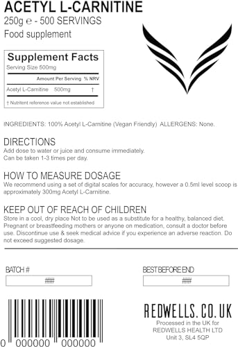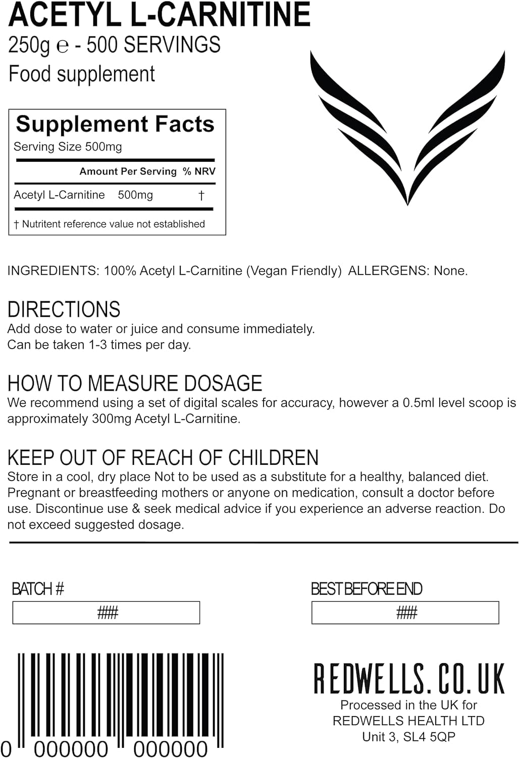 Acetyl L-Carnitine Powder (ALCAR) REDWELLS Premium Quality Vegan (250g)