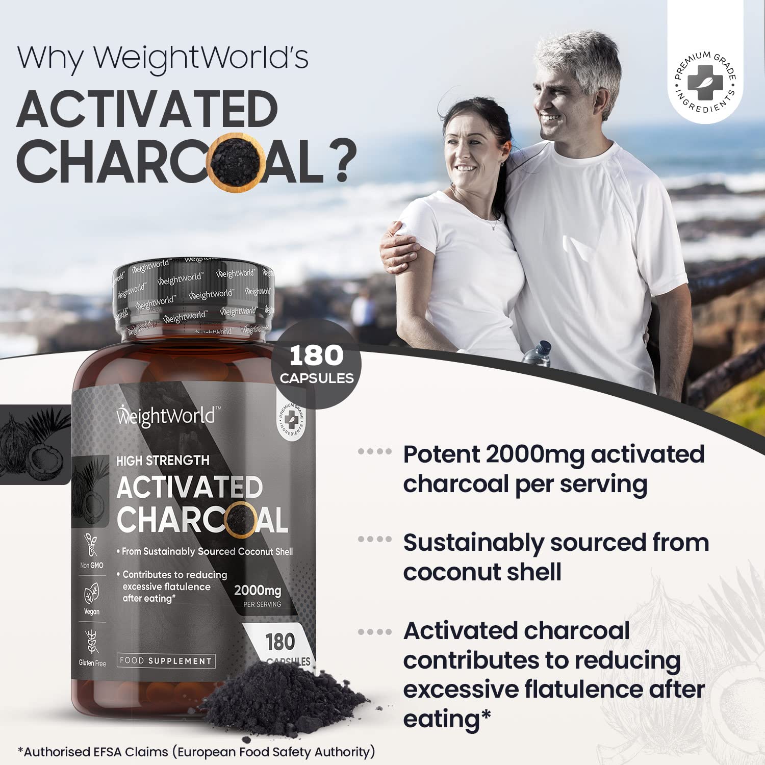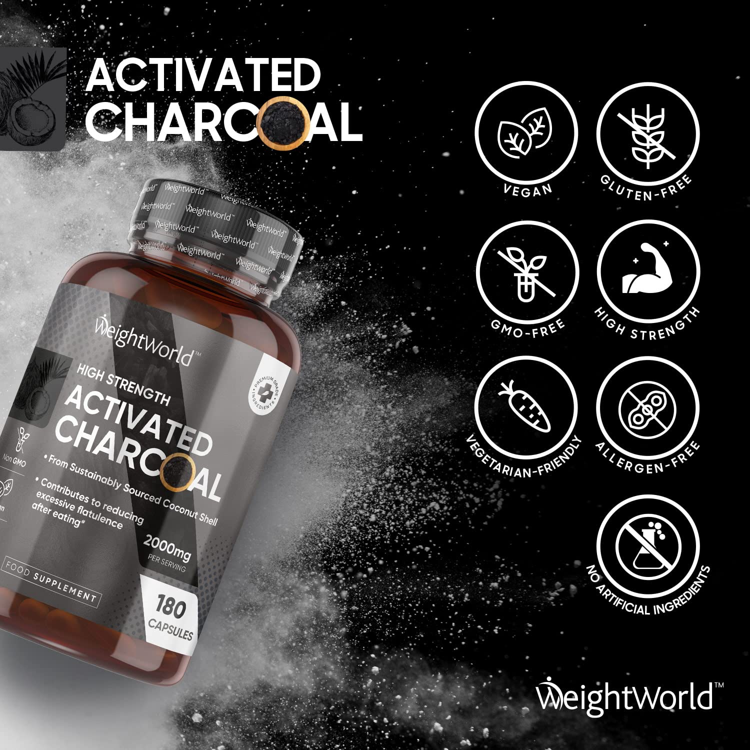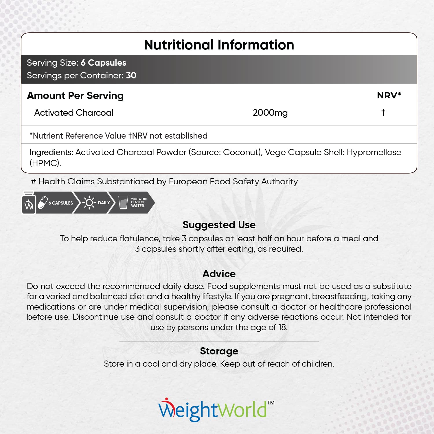 Why WeightWorld's Activated Charcoal Supplement? Looking for an answer to your digestion comfort? Our activated charcoal pure capsules are for you. Why WeightWorld's Activated Charcoal Capsules? Are you looking for an effective & natural digestion supplement to make your life easy & light? Then WeightWorld's premium Activated charcoal powder capsules are here. Each serving of our charcoal supplement (not activated charcoal tablets) offers steam-activated Charcoal derived from sustainably sourced premium coconut shells. Unlike charcoal pills, our capsules use a highly absorbent formula that makes them gentle on your stomach. Quickly Absorbing, 3rd Party Tested Activated Charcoal Powder Capsules: Unlike other anti-flatulence tablets/active charcoal tablets or Charcoal tablets (anti bloating tablets/wind comfort tablets) for flatulence, our capsules are easy to swallow. Moreover, our natural charcoal capsules, unlike other vegan charcoal tablets, are third-party tested by AgroLab for potency to ensure our customers' peace of mind. The high-quality & natural coconut shells used to derive activated Charcoal assure maximum absorption & fast action. Gluten, Allergen & GMO-Free, Vegan Activated Charcoal Capsules: Our Charcoal supplement is gluten, GMO, & allergen-free. These activated charcoal pure capsules are Vegan, Vegetarian, and keto diet-friendly. Charcoal tablets coconut activated charcoal charcoal tablets for flatulence. Our charcoal supplement is no exception. We manufacture to GMP standards and are happy to offer an exclusive 90-day money-back guarantee if you are unsatisfied. How Activated Charcoal Supplement Can Help You? Activated Charcoal is a naturally porous material that works to bind & absorb unwanted toxins, transporting them via your digestive system for safe disposal. Utilizing activated charcoal capsules can decrease post-meal (not charcoal tablets), as it has received approval from the EFSA. Go natural and prioritize a healthy lifestyle!More Info