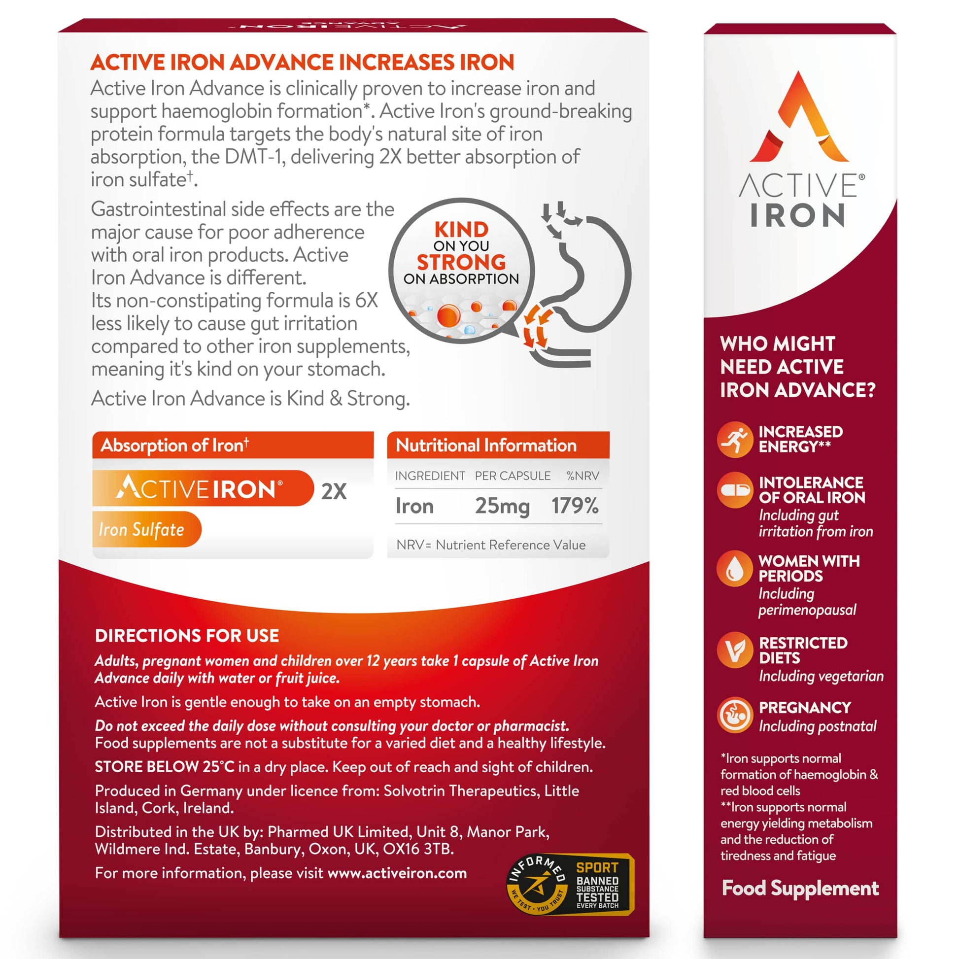 Active Iron Advance 25mg Iron Supplement | Non- Constipating | Clinically Proven to Increase Iron Levels | Fights Tiredness & Fatigue | 30 Daily Capsules