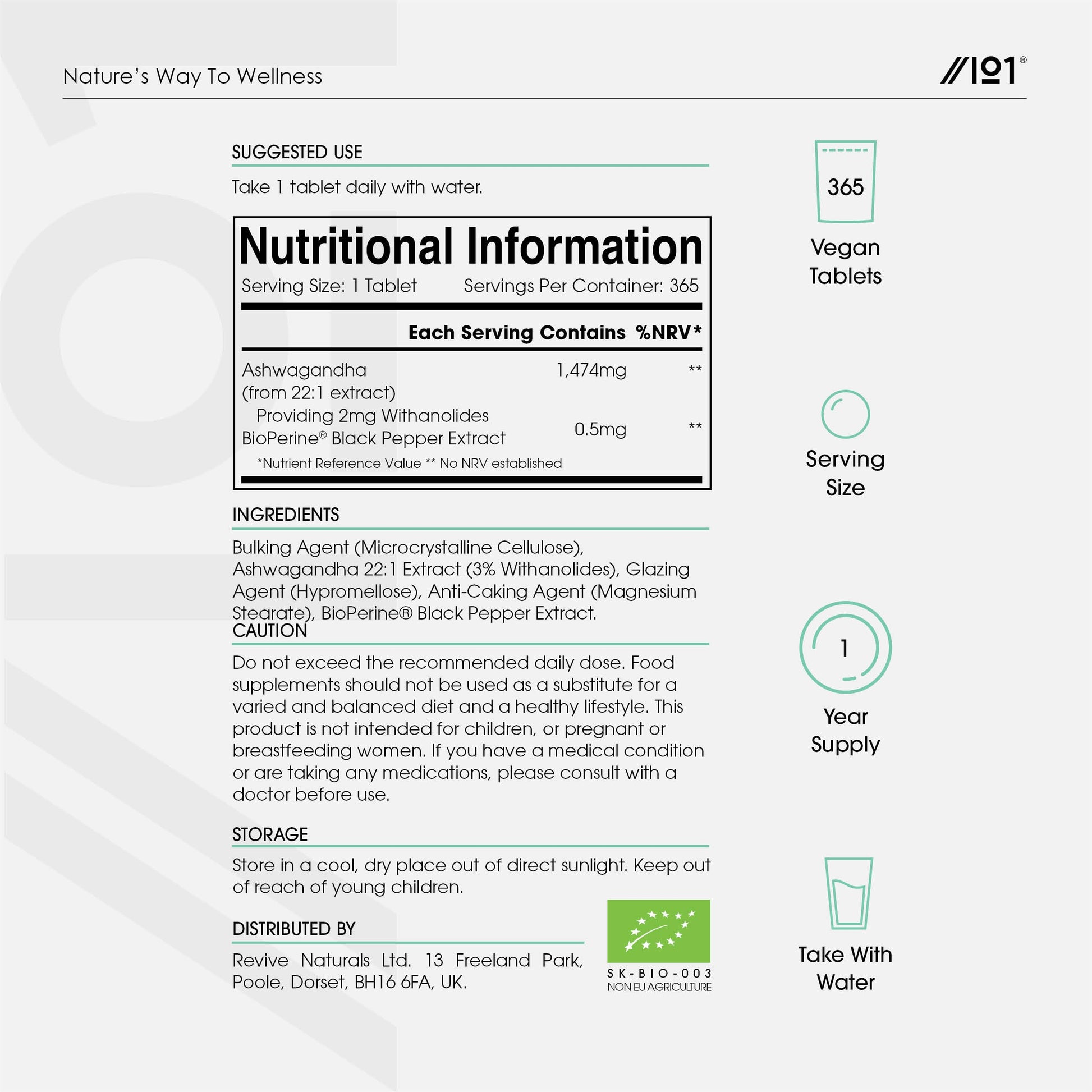 ALPHA01 Ashwagandha Extract 1474mg with BioPerine® - 365 Vegan Tablets (1 Year Supply) - Potent 3% Withanoids - High Strength Ashwagandha Root Extract (not Ashwagandha Capsules)