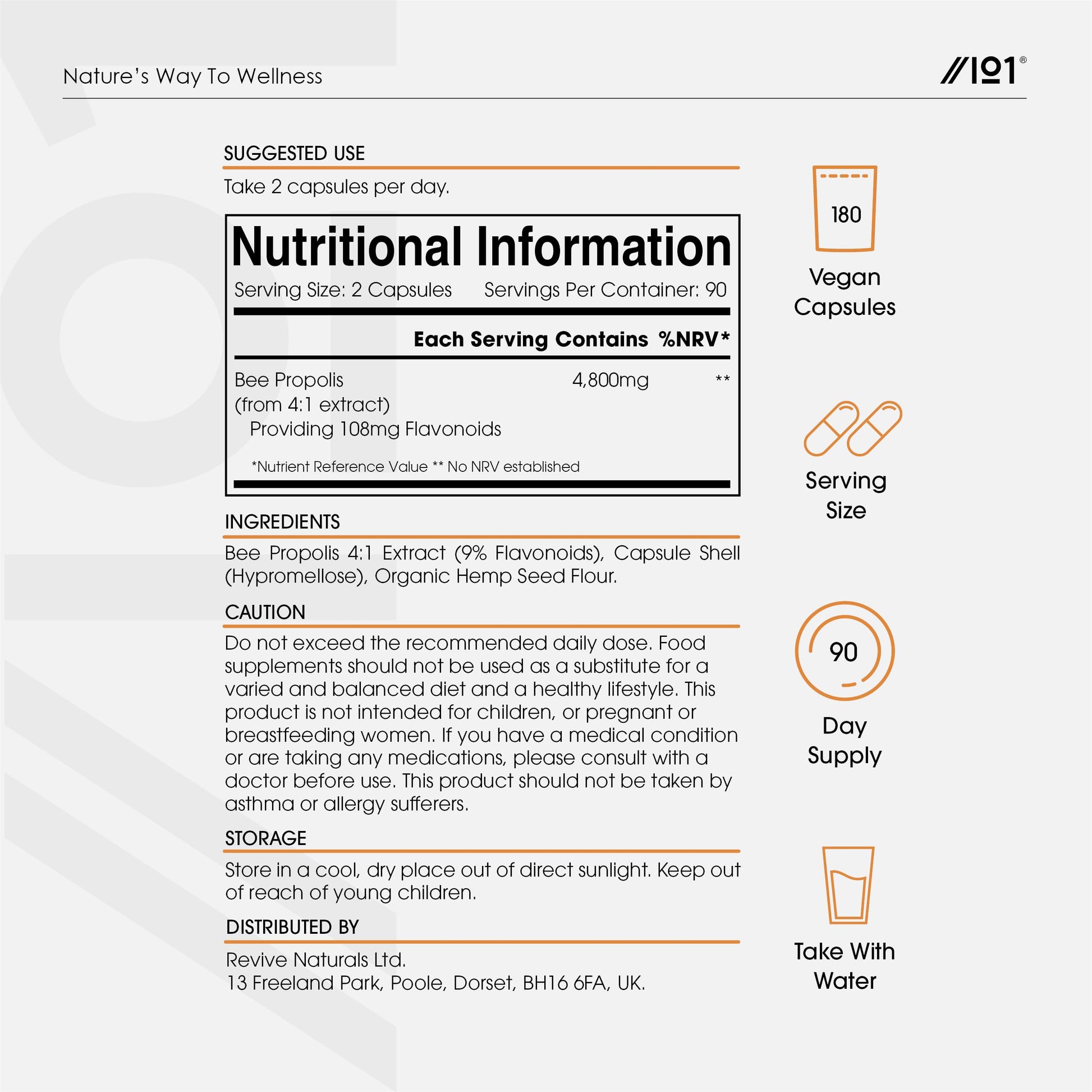 Bee Propolis is a natural resin-like material produced by honey bees to protect the hive. A mixture of pollen and beeswax, it has a complex chemical composition and is rich in flavonoids. Each serving contains the botanical equivalent of 4,800mg of Bee Propolis, providing 108mg of naturally-occurring flavonoids.More Info