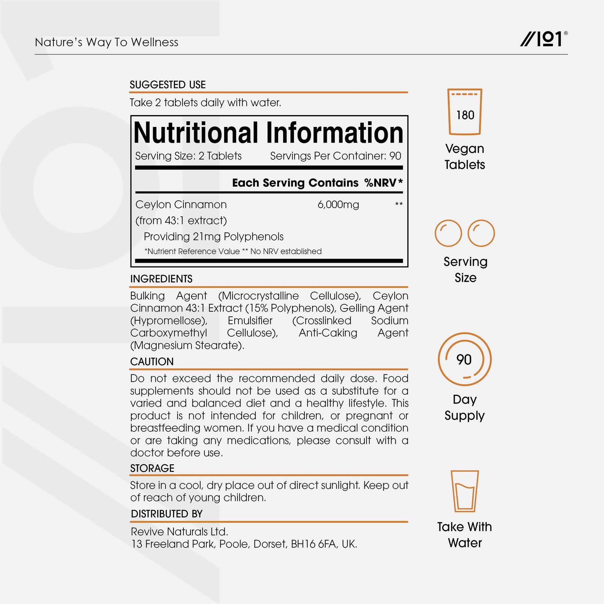 ALPHA01 Cinnamon Extract 6000mg - Standardised 15% Polyphenols from 43:1 Cinnamon Extract - 180 Vegan Tablets (6 Months Supply) – Resealable and Recyclable Pouch by Alpha01