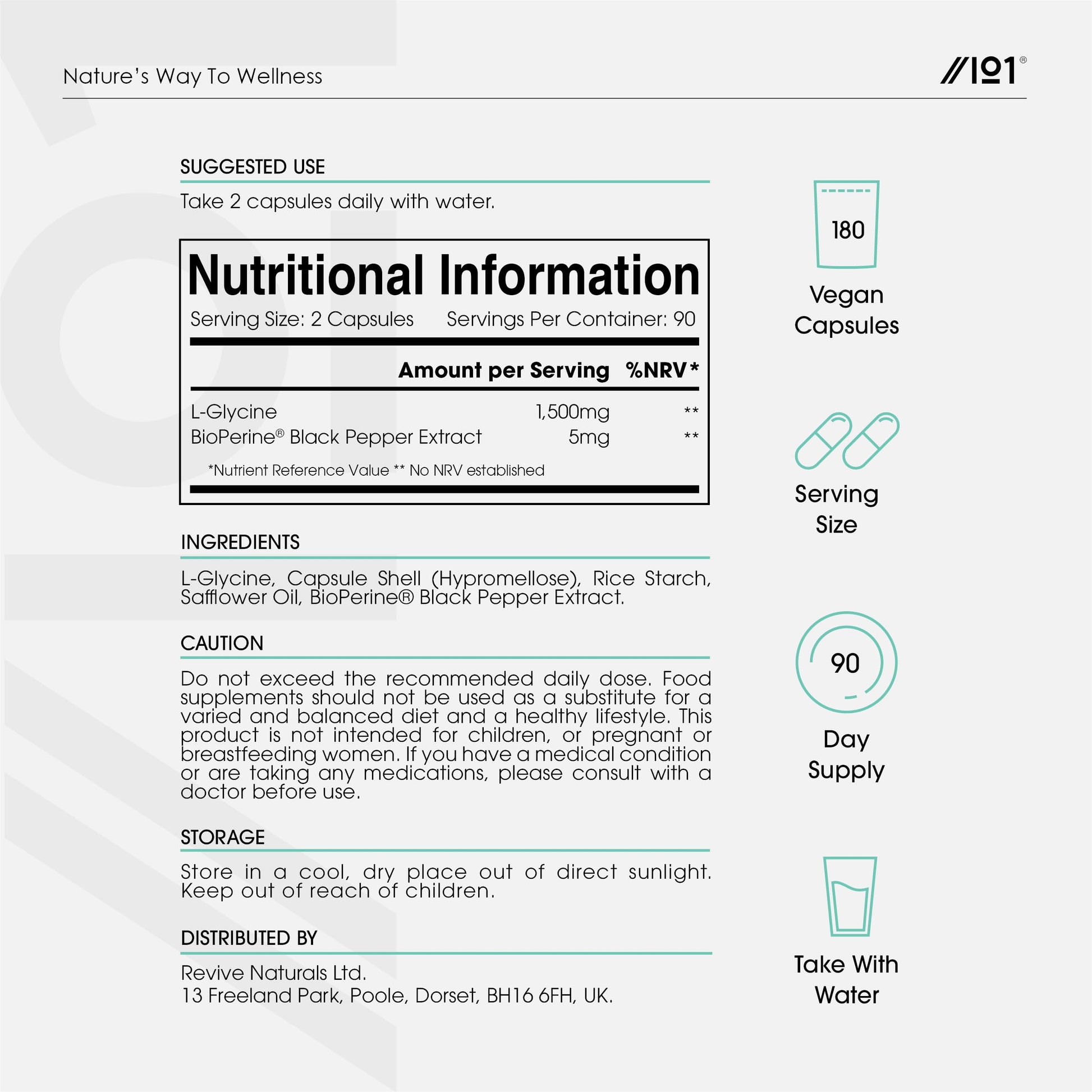 Produced naturally by the human body, L-Glycine is a proteinogenic amino acid that is also a key component of collagen and elastin. It can also be found in certain protein-rich foods, such as meat, fish, dairy, seeds and nuts. Each serving contains 1,500mg of L-Glycine, which has been combined with BioPerine black pepper extract for increased absorption.