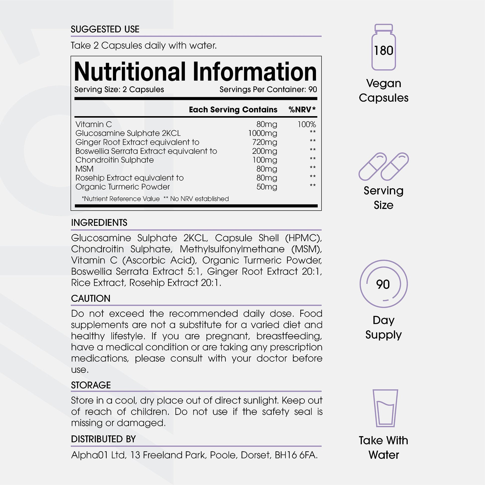 This product contains 700mg of Glucosamine & 140 Chondroitin, we also added MSM, Boswellia, Vitamin C, Rosehip, Ginger & Turmeric for a synergistic effect. Always fair trade and non-GMO, this supplement is made from premium ingredients sourced in Europe and meets all food safety requirements.More Info