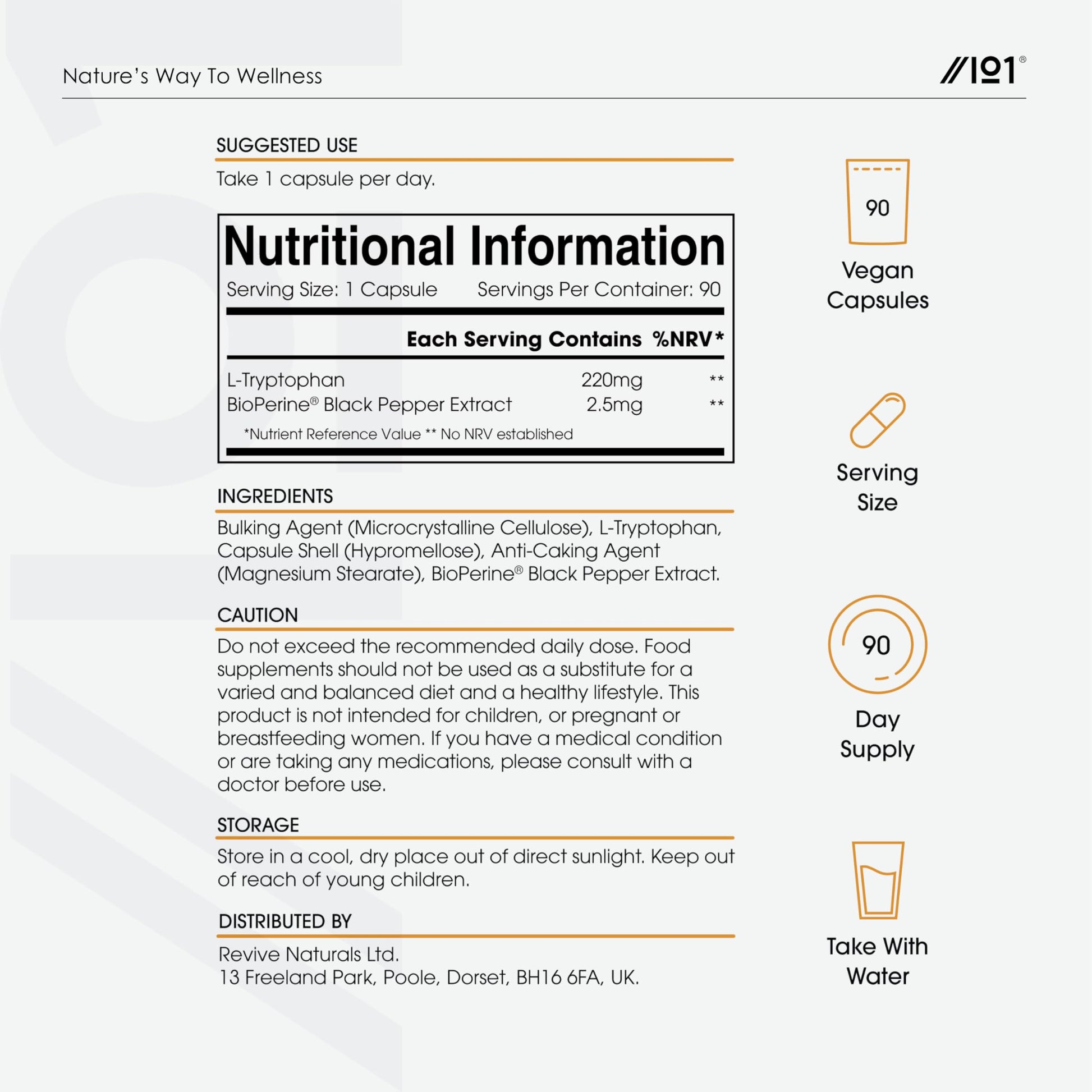 ALPHA01 L-Tryptophan 220mg with BioPerine® - 90 Vegan Capsules – Naturally Fermented L-Tryptophan Supplement with Black Pepper Extract for Increased Bioavailability - 3 Months Supply - by Alpha01