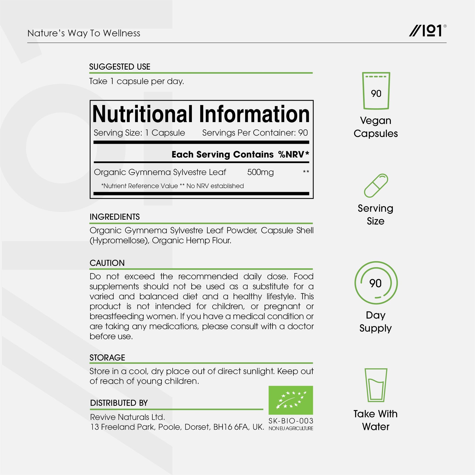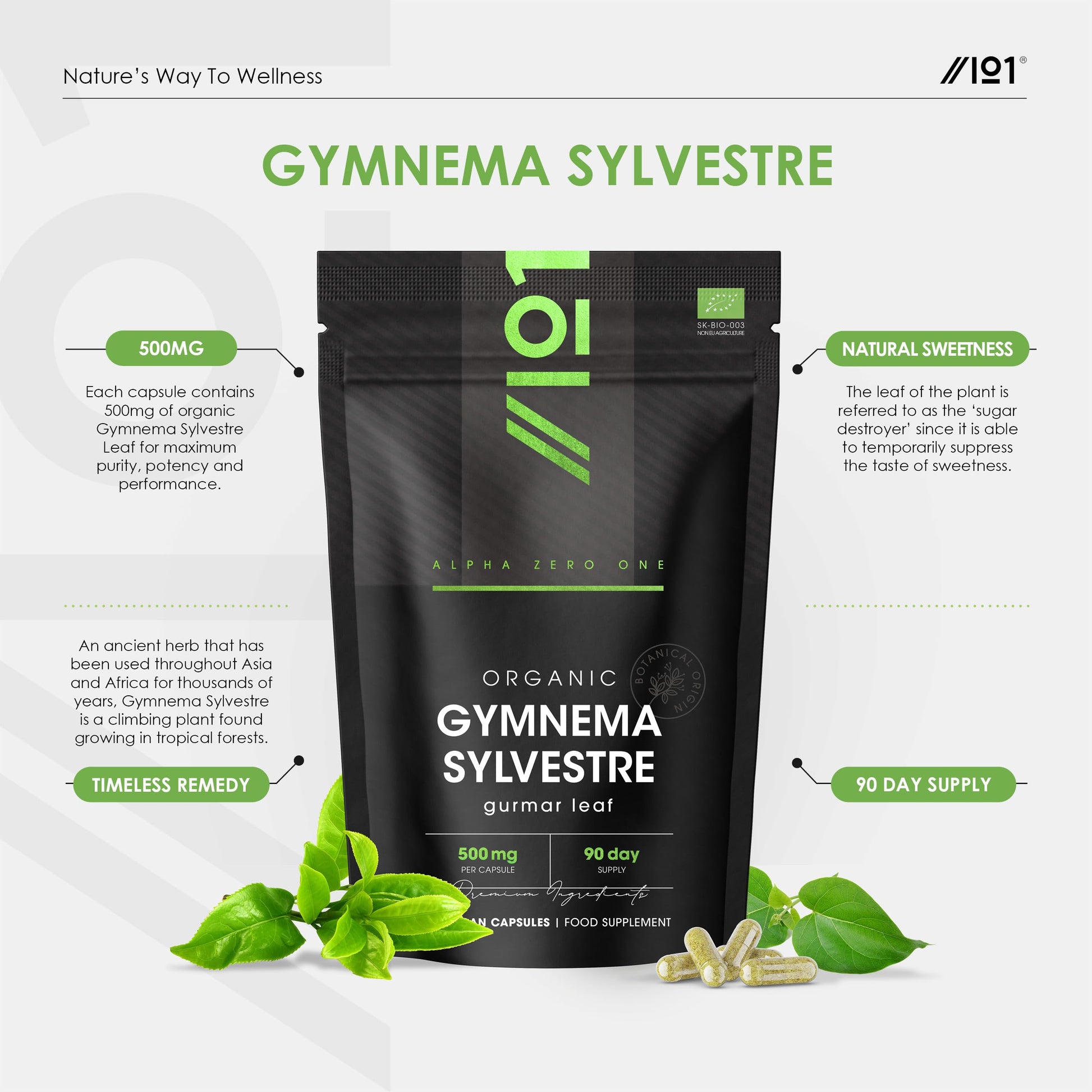 ALPHA01 Organic Gurmar (Gymnema Sylvestre) 500mg - 90 Vegan Capsules (3 Month Supply) – High Strength Gurmar Leaf Supplement – Resealable and Recyclable Pouch by Alpha01