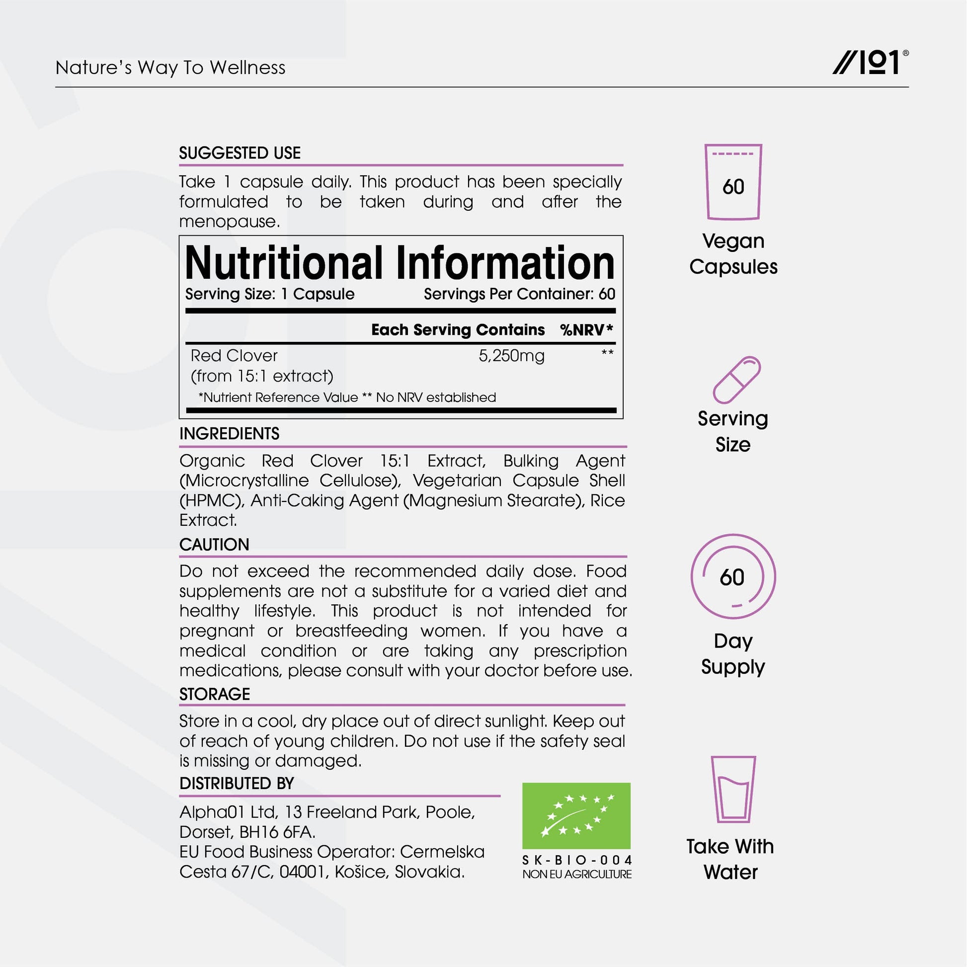 ALPHA01 Organic Red Clover Extract 5250mg - for Use During The Menopause - Potent 15:1 Pure Extract - Halal – 60 Vegan Capsules