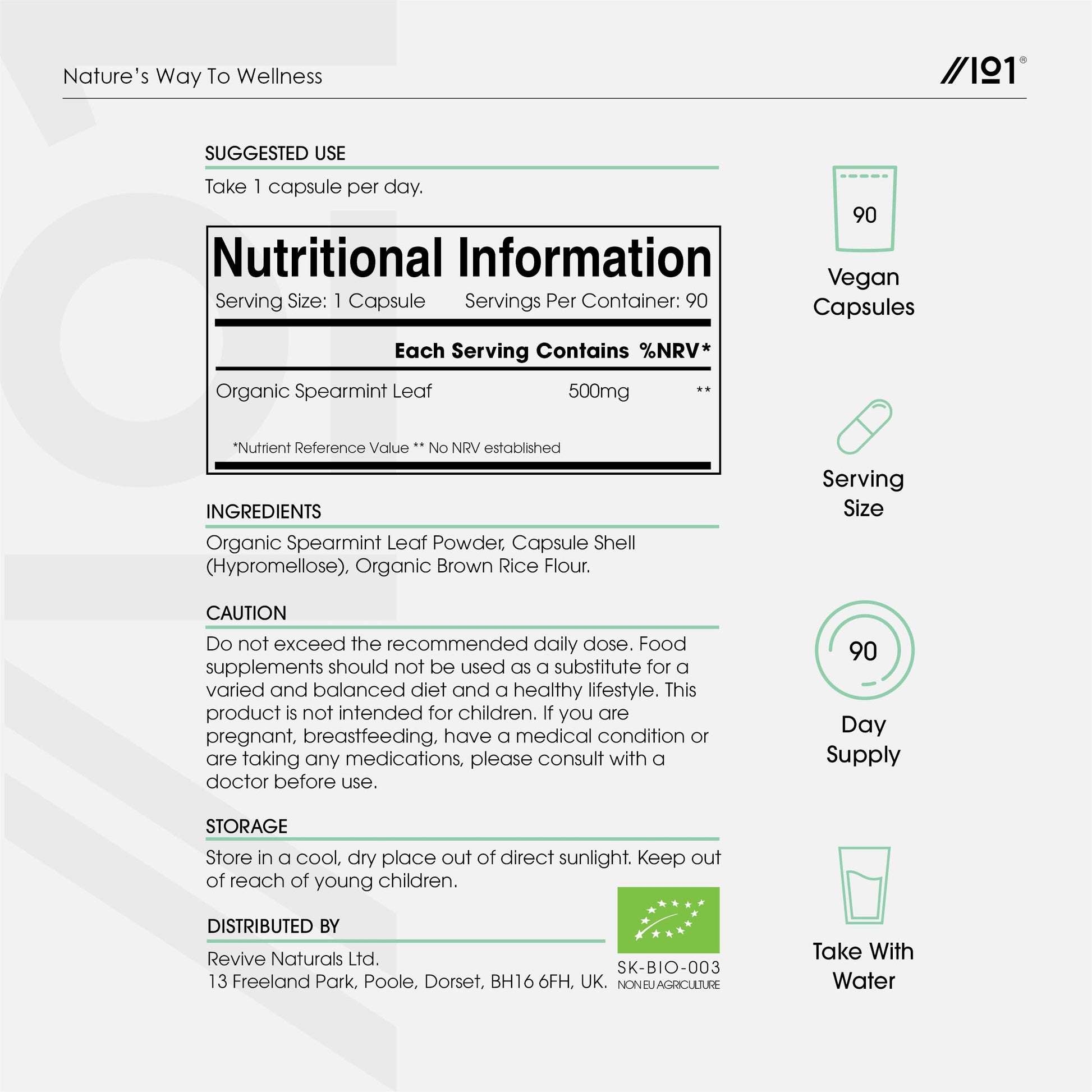 ALPHA01 Organic Spearmint Leaf 500mg – 90 Vegan Capsules – High Strength Mentha Spicata Supplement – Resealable and Recyclable Pouch by Alpha01