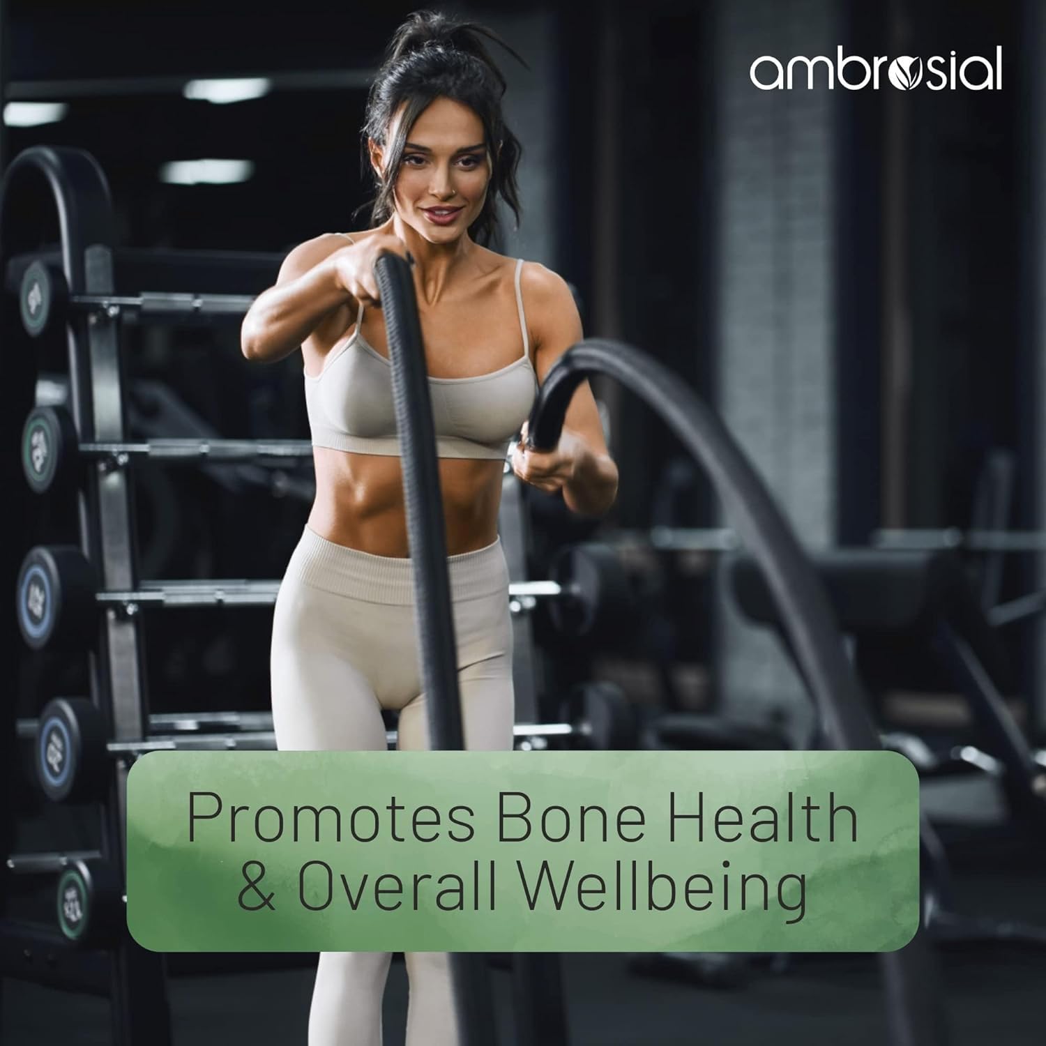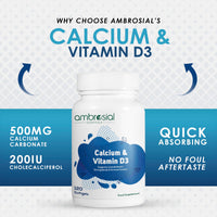 Introducing Ambrosial Calcium & Vitamin D High Potency Supplement – a meticulously formulated product designed to support the bone health, muscle function, and dental strength of your entire family. Encompassing a comprehensive blend of essential nutrients, this supplement is ideal for women, children, and adults requiring an additional boost of calcium and vitamin D. Calcium is a crucial mineral that plays a fundamental role in the development and maintenance of strong bones and teeth. It also supports nerve transmission, muscle function, and cardiovascular health. Vitamin D, particularly vitamin D3, enhances the absorption of calcium, making it indispensable for optimal bone health. Our high-strength vitamin D tablets ensure that your body can effectively utilize the calcium provided, preventing deficiencies and promoting overall well-being. Our high-strength calcium and vitamin D tablets for adults are an excellent choice for those who lead busy lifestyles and may not always get sufficient nutrients from their diet. Additionally, the inclusion of vitamin D with calcium tablets for adults ensures comprehensive support for bone health, muscle function, and immune system strength. Choose Ambrosial Calcium & Vitamin D High Potency Supplement to invest in your family's health. With our expertly crafted formula, you can be confident that you are providing the best possible care for your bones, muscles, and teeth. Experience the benefits of high-quality calcium and vitamin D today – because your health deserves nothing less.More Info