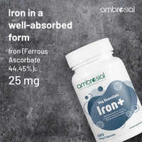 Ambrosial Iron Tablets High Strength 25mg| Iron Supplements for Women & Men Blood Support & Helps Reduce Tiredness & Fatigue | Enhanced Absorption & Non - Constipating (Pack of 1-120 Capsules)
