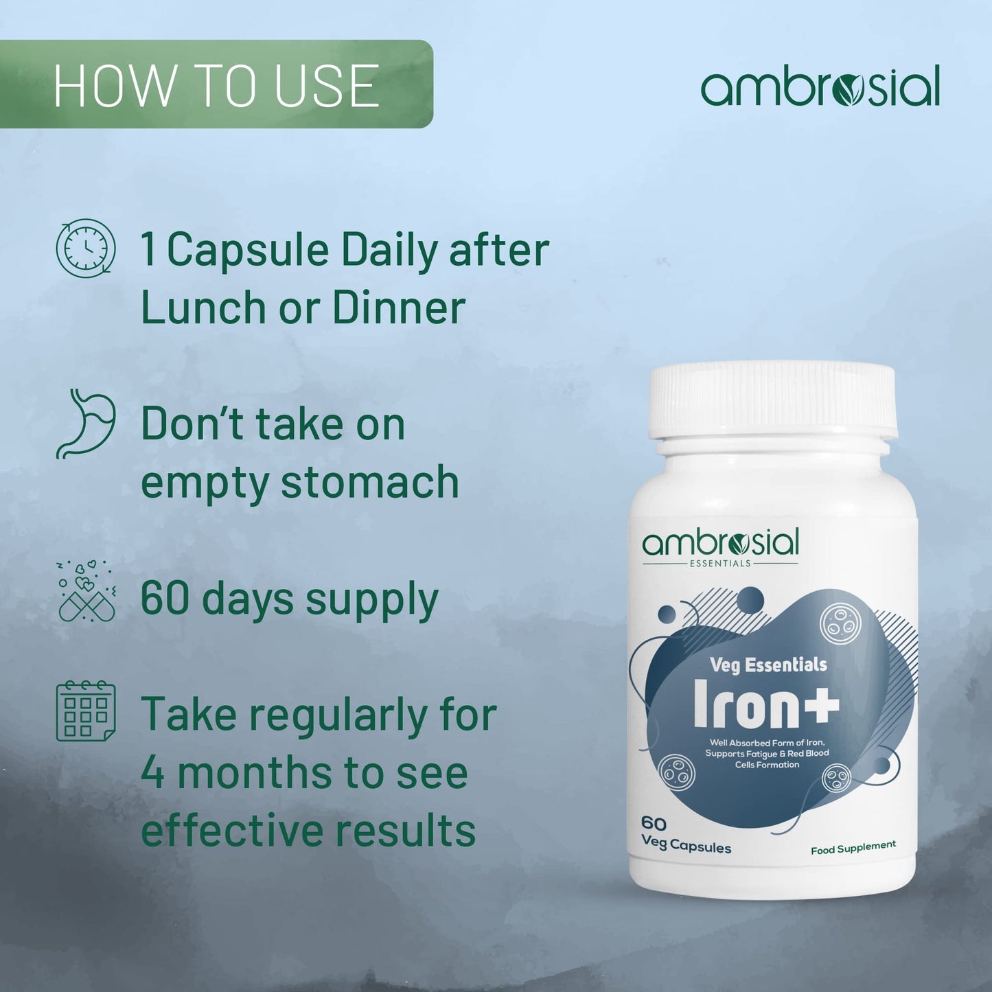 Ambrosial iron supplement for women and men provides 25mg of iron per serving. Our iron pills have a vegan capsule and each tub contains 60 iron tablets which provides a two month supply. Supplementing with iron vitamins provides many health benefits – it can boost energy levels, reduce tiredness, support red * cell synthesis, mental alertness and many more. Iron supplements helps support everyday life.More Info