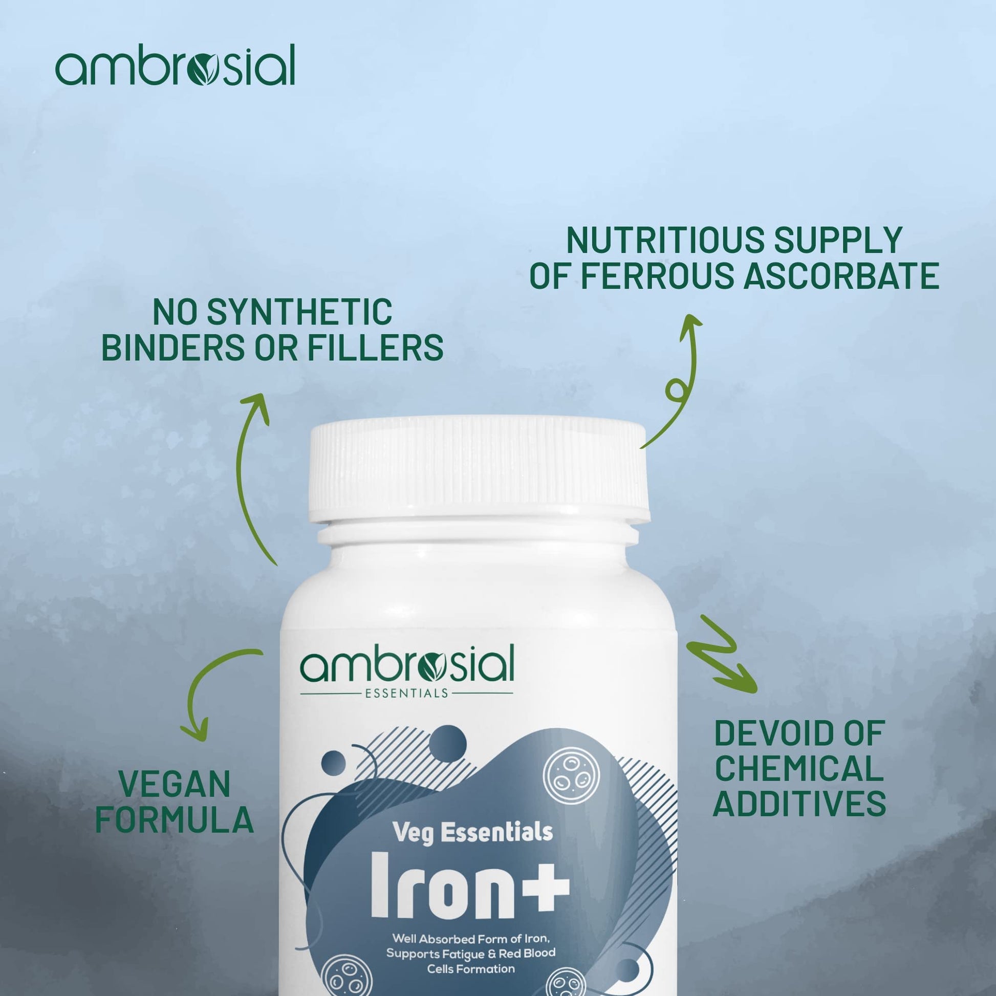 Ambrosial Iron Tablets High Strength 25mg| Iron Supplements for Women & Men Blood Support & Helps Reduce Tiredness & Fatigue | Enhanced Absorption & Non - Constipating (Pack of 1-60 Capsules)