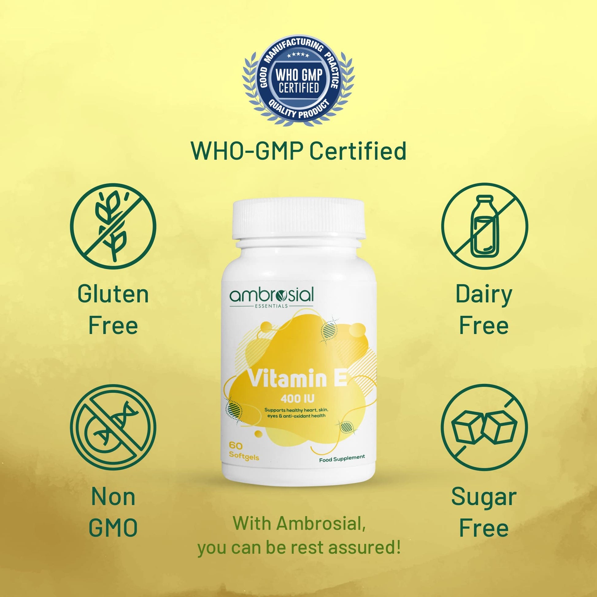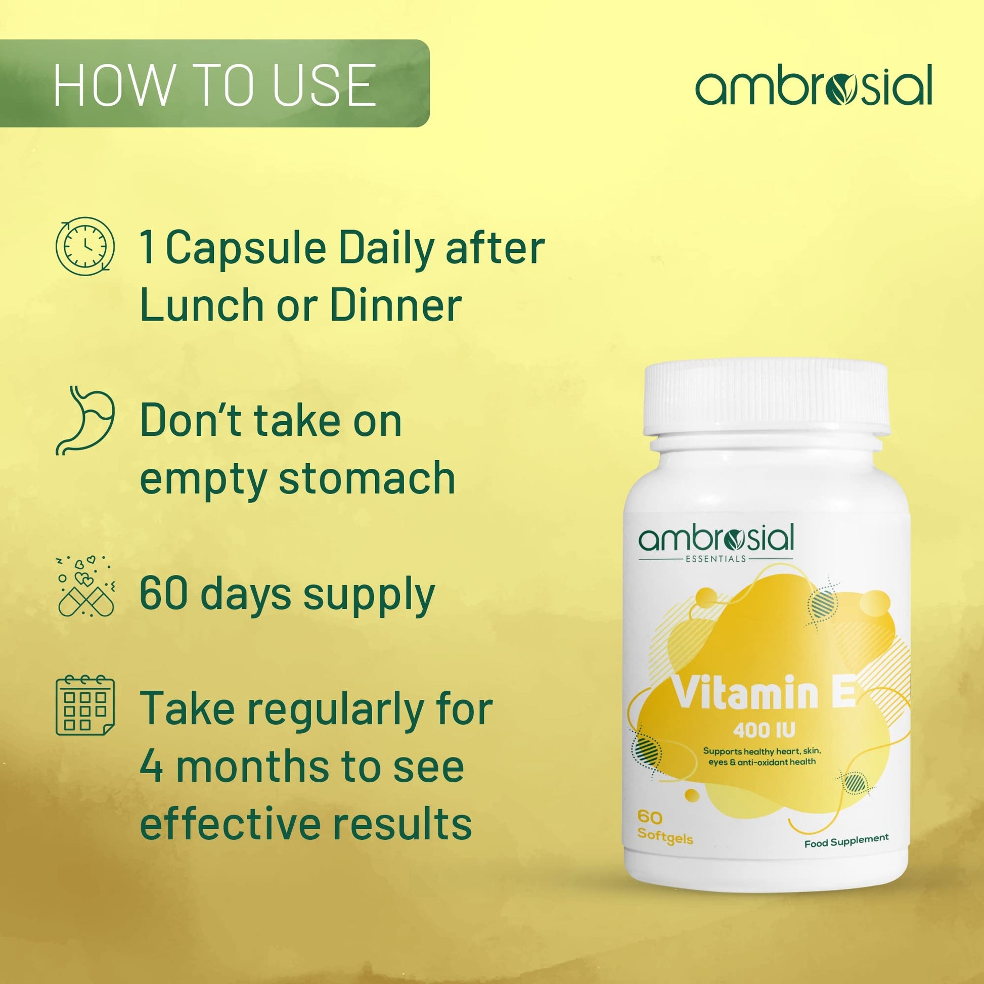 Ambrosial Vitamin E Capsules for Skin & Face VIT E 400 IU| Natural & Pure Vitamin E Oil Capsules |Highly Absorbable & High Strength| Hair Skin & Nail Vitamins for Women & Men (Pack of 1-60 Softgels)