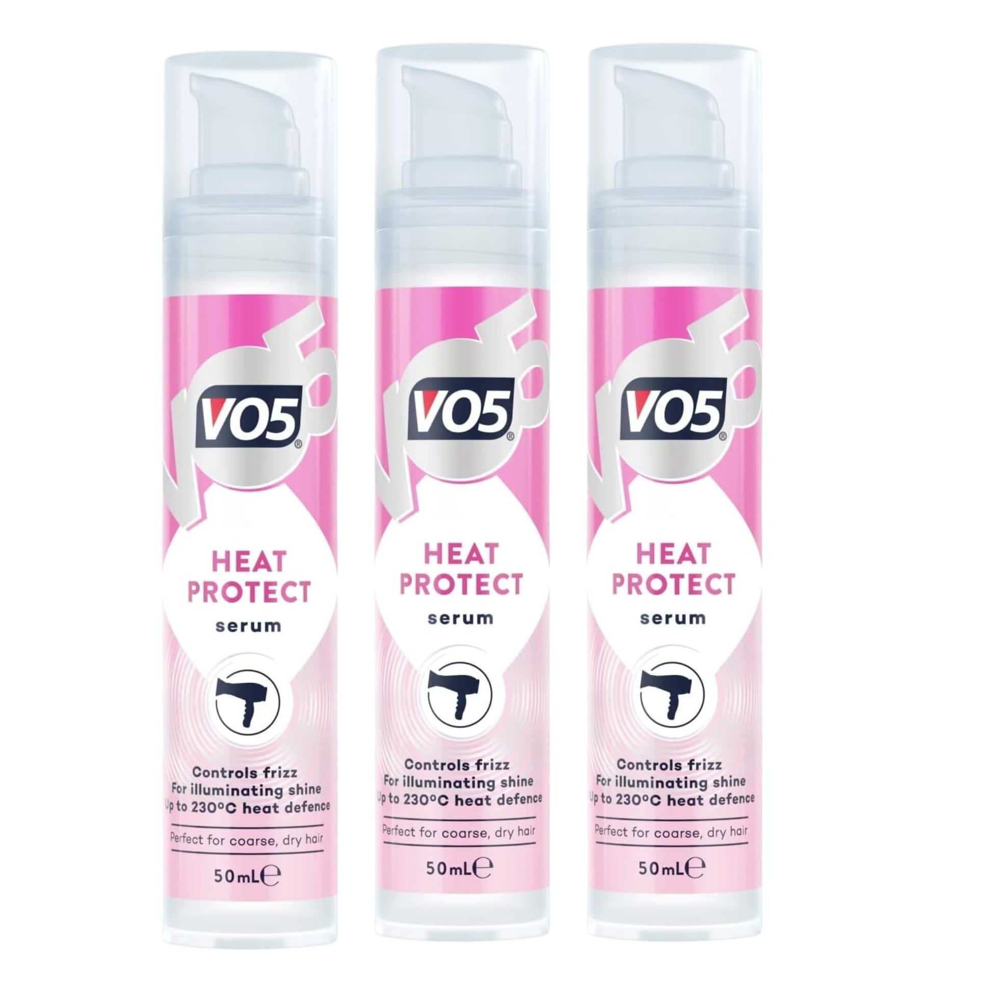 Description Although many of us enjoy the sleek end result achieved with a hairdryer or straightener, or the springy curls and waves crafted with the twist of a curling iron, the damage that heat inflicts on our hair is many times an afterthought. Fortunately, using the VO5 Heat Protect Hair Serum can provide a safeguard for hair by acting as a barrier between intense heat and fragile strands and shielding hair from temperatures up to 230°C. This heat protectant serum helps protect coarse, dry hair against the damage caused by heat-styling tools and tames frizz and flyaways, leaving your hair beautifully smooth and shiny. For best results: Use on damp or dry hair. Rub a few drops between palms and apply from mid-length to ends. Use a wide-tooth comb or brush to distribute the product through the hair. Dry, curl and straighten as desired. Style tip: For a super sleek look, apply the product before you blow dry. For curly hair, apply product once hair is dry to define the curls and lose the frizz. If you like the VO5 Heat Protect Serum, be sure to check out the rest of the VO5 Heat Protect range, including our heat protection spray, for more ways to protect your hair against damageMore Info