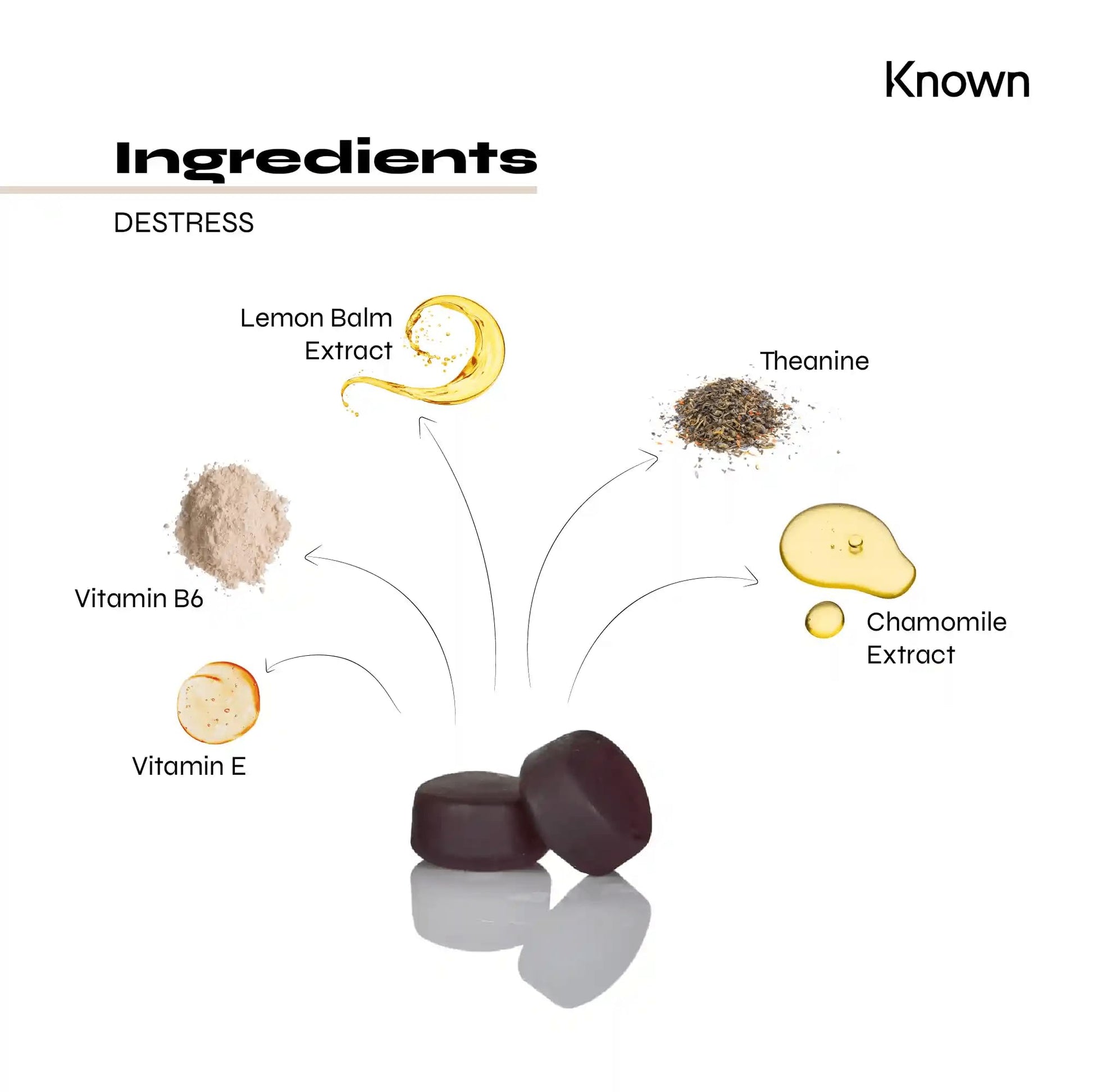 Welcome to our natural, delicious chill pill. Known Destress gummies are designed to help you relax and clear your mind. Expertly blended by our in-house nutritionist with key ingredients to help counter the acute effects of stress and mental tension, go from overwhelmed to calm with these comprehensive plant-based stress support gummies. Containing an essential blend of Lemon Balm and Chamomile extracts with added Vitamin B6, Vitamin E, and Theanine, our Destress Gummies have been designed to help manage stress and promote a calm and positive mood. Perfect for those who struggle to swallow capsules, our easy-to-take and deliciously tasty Mixed Berry flavour supplements can also help reduce fatigue and tiredness. They are suitable for Vegan, Halal and Kosher diets and free from artificial colours, flavours and preservatives. Each tub contains 60 gummies, offering one month’s supply.More Info