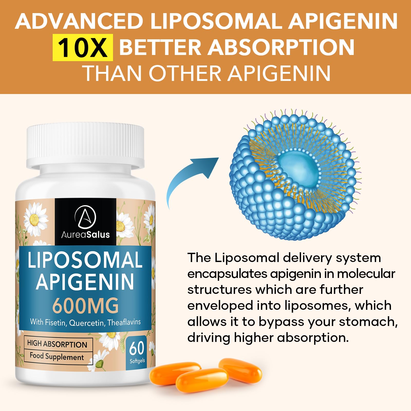 Apigenin 600mg, Extra Strength Liposomal Apigenin Supplement with Fisetin, Quercetin and Theaflavins for Sleep, Relaxation & Mood, Powerful Flavonoid & Antioxidants (60 Count (Pack of 1))