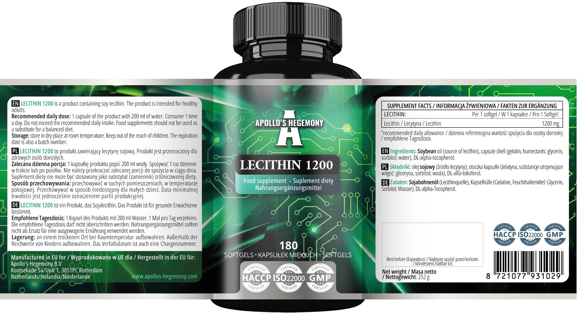 APOLLO'S HEGEMONY Lecithin 1200mg with Vitamin E - 180 Softgel Capsules - High Strength Soy Lecithin Supplement - 6 Months Supply - Supports Cognitive and Cardio Health - by Apollo's Hegemony