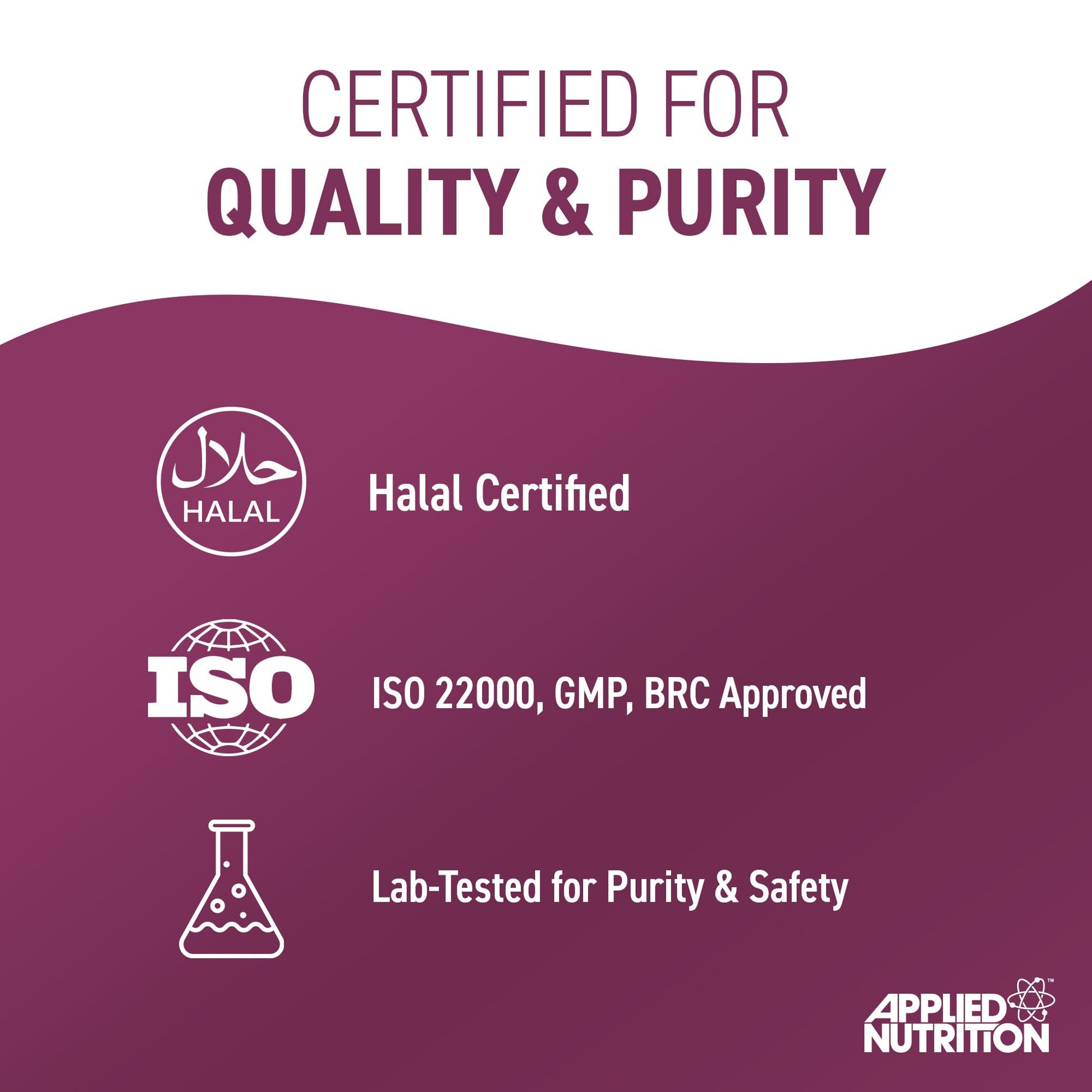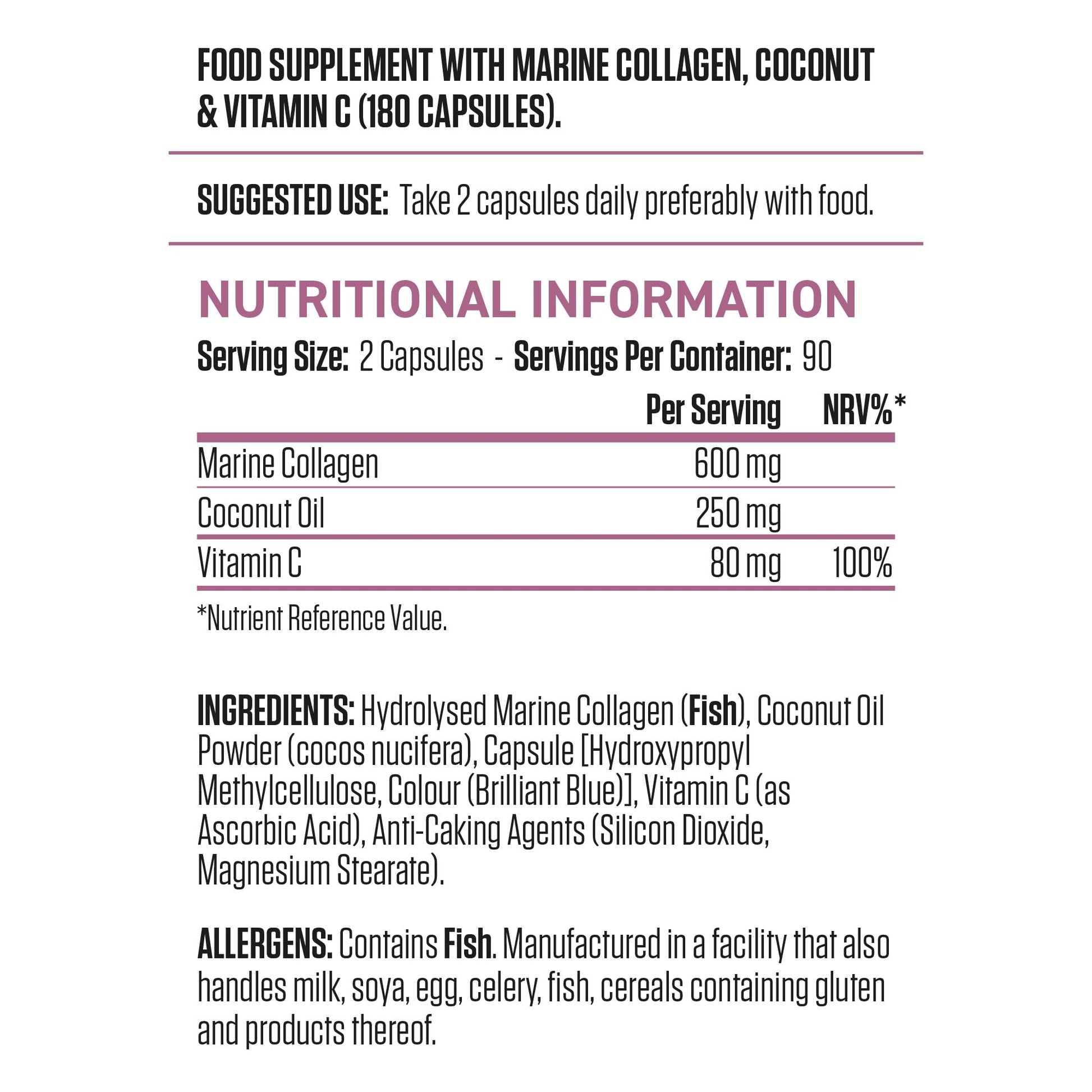 Applied Nutrition Collagen + Coconut Capsules are designed to enhance beauty from within by promoting healthy skin, stronger nails, and shinier hair. This advanced formula combines Hydrolyzed Marine Collagen, Vitamin C, and Coconut Oil Powder to support skin elasticity, hydration, and overall appearance while also contributing to joint and connective tissue health. Each serving delivers 600mg of Hydrolyzed Marine Collagen to help maintain skin firmness and hydration, 80mg of Vitamin C to enhance collagen production and absorption, and 250mg of Coconut Oil Powder to nourish and hydrate the skin from within. Collagen is a vital protein that plays a key role in maintaining the structure of skin, hair, nails, and joints. As natural collagen levels decline with age, supplementing with marine collagen helps to support youthful skin, promote skin elasticity, and strengthen hair and nails. The added Vitamin C enhances collagen synthesis, while Coconut Oil Powder supports absorption and provides additional hydration benefits. Unlike traditional collagen powders that require mixing, these easy-to-swallow capsules offer a convenient, mess-free way to incorporate collagen into a daily routine. Applied Nutrition Collagen + Coconut Capsules are Halal-certified and made with a plant-based capsule, making them suitable for various dietary and lifestyle needs. Ideal for individuals looking to maintain a youthful complexion, support hair and nail health, and promote overall wellness, this high-quality supplement is designed to deliver visible beauty benefits from within. Simply take two capsules daily with food to start seeing results.More Info
