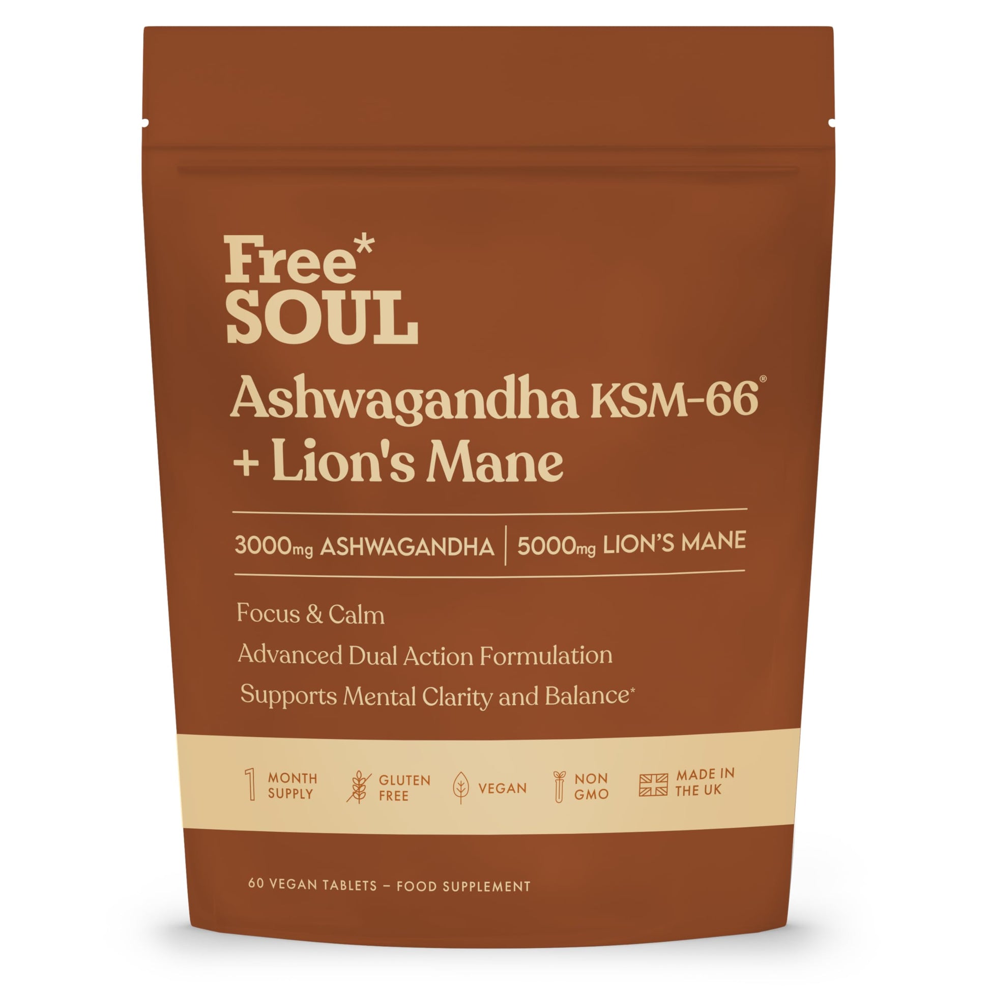 Ashwagandha KSM-66® + Lion’s Mane Complex | 5000mg Lion’s Mane + 2500mg Ashwagandha High Strength | Added + Zinc + Vitamin B6 | Cognitive & Mood Support | Vegan Tablets | Free Soul