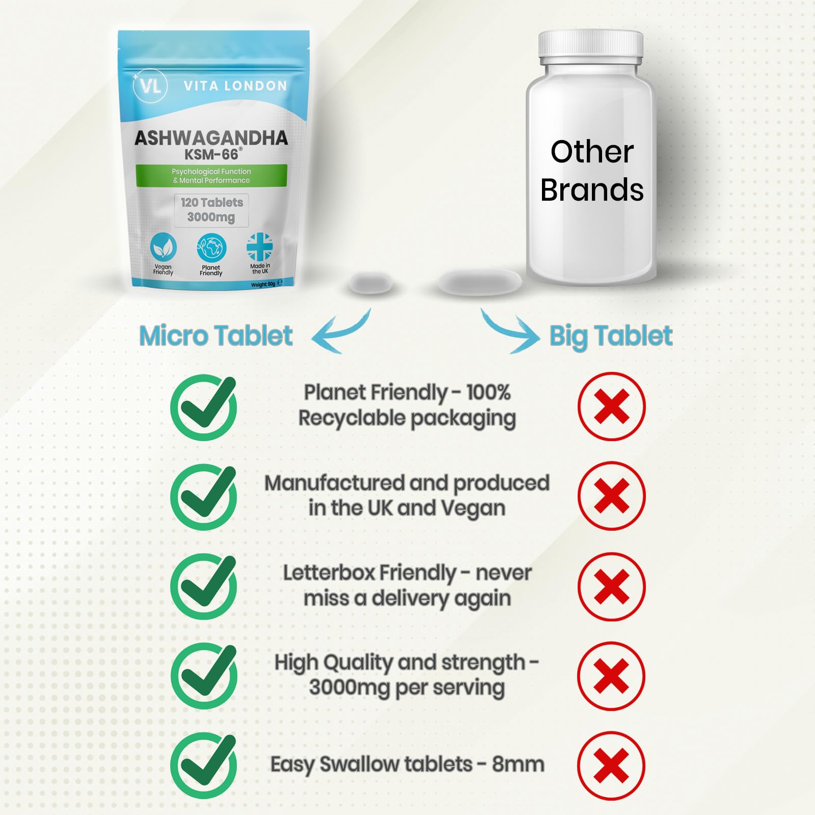 Vita London Supplement Range - High Quality products manufactured and produced in the UK. Support UK industry. Ashwagandha Organic KSM-66 Tablets - Natural and organic root extract. Ashwagandha (Withania somnifera), also known as Indian Ginseng, is an herb used in Ayurveda, the traditional medicine of India typically used to help with stress, mood and anxiety. Smaller 'easy swallow' tablets with the same high strength and quality. Dairy, GMO, Gluten, Wheat & Soy FREE. No added sugars, colours or preservatives. VEGAN. Recyclable, resealable and 'letterbox friendly' packaging.More Info