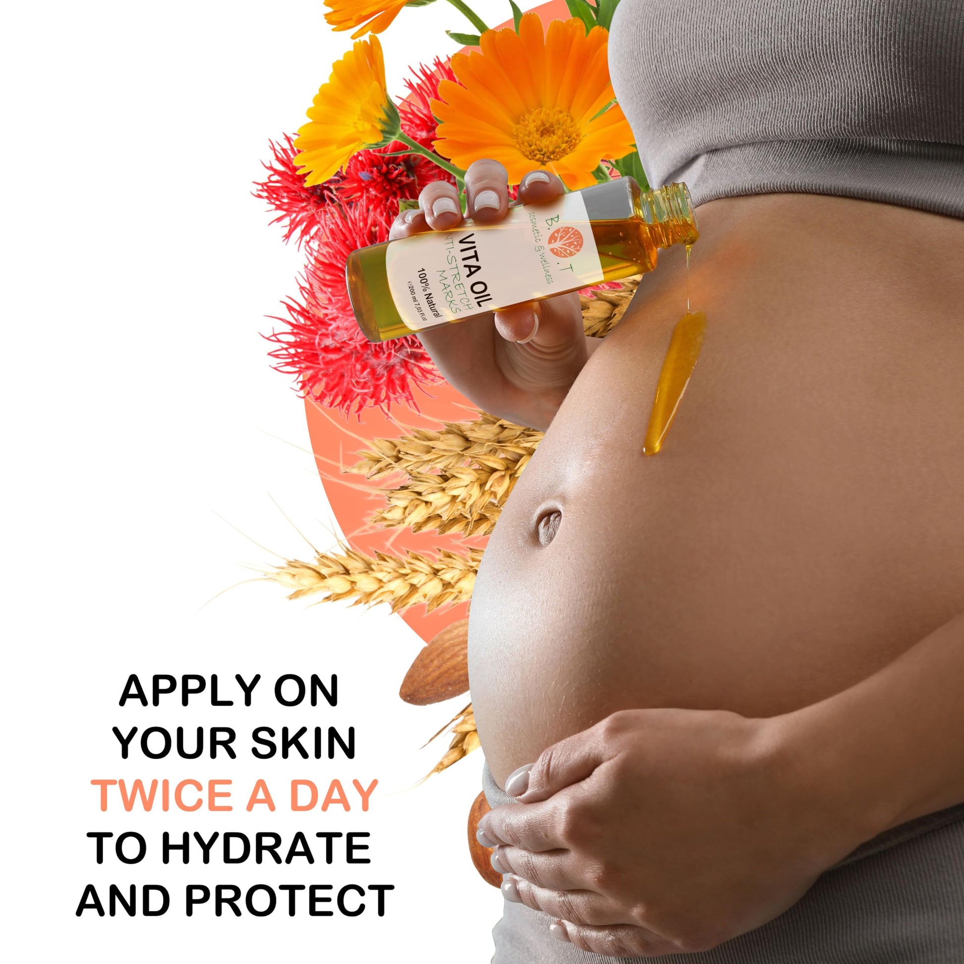 B.O.T cosmetics & wellness presents Vita-Oil, based on natural vegetable oils.Effective Formula specially designed to prevent and combat stretch marks as a result of pregnancy, age or sudden changes in weight.
