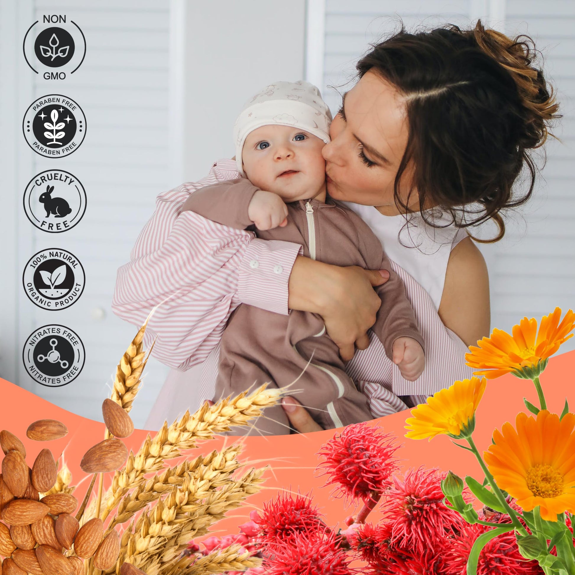 Sweet almond oil, Vitamin A, Vitamin E, Wheat Germ Oil, Castor Oil, Calendula Oil and Tocopherol.