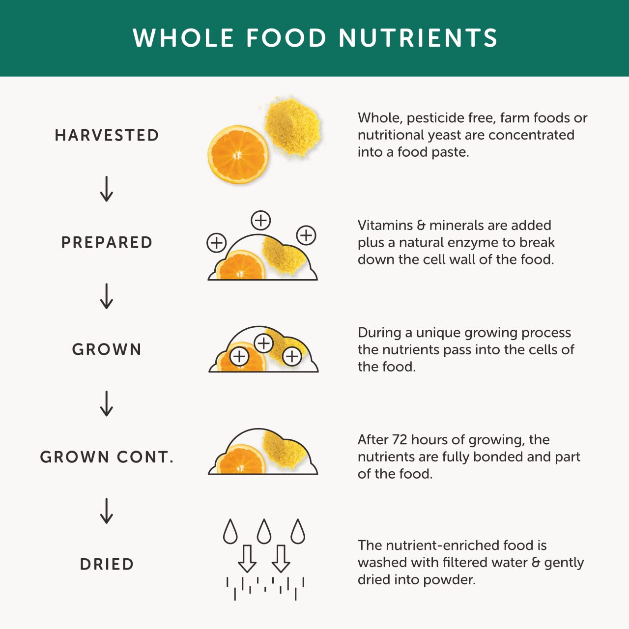 - EFFECTIVE & EASILY ABSORBED: All our food-based nutrients are raw and complete. Using carefully controlled low-heat conditions, we preserve all the naturally occurring goodness you find in fresh foods, like live enzymes and phytonutrients, amino acids, trace minerals and other bioactive co-factors. This means our bodies recognise the nutrients as food, making them easily absorbed and more effective than synthetic isolated nutrients.