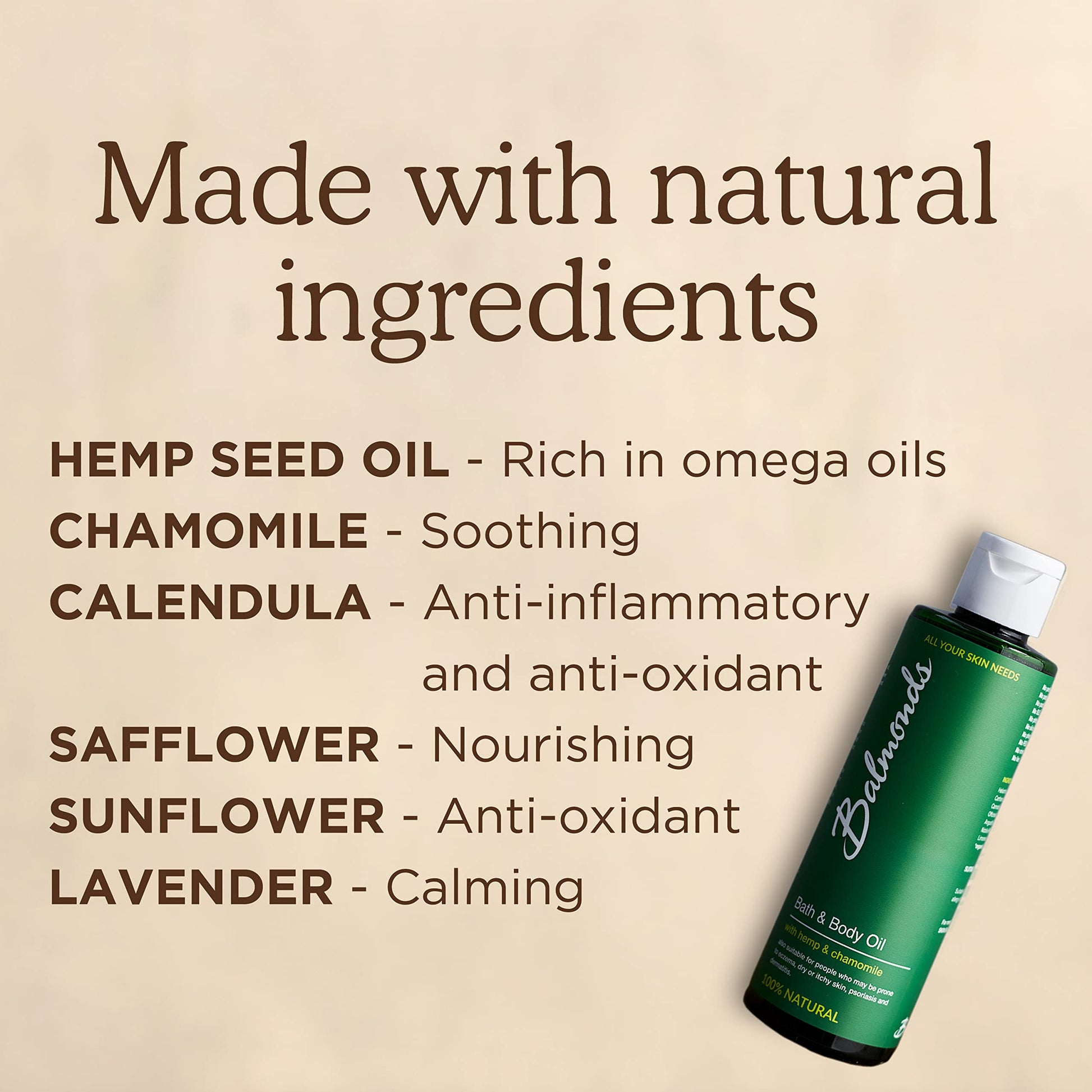- ✅ 100% NATURAL: Balmonds emollient body oil is made from a unique blend of super nutritious botanicals, including hemp, olive and chamomile, and is suitable for all ages and skin types. Balmonds Bath & Body Oil is safe to use on babies and children. It can be used on any area of the body, including face, hands & feet.