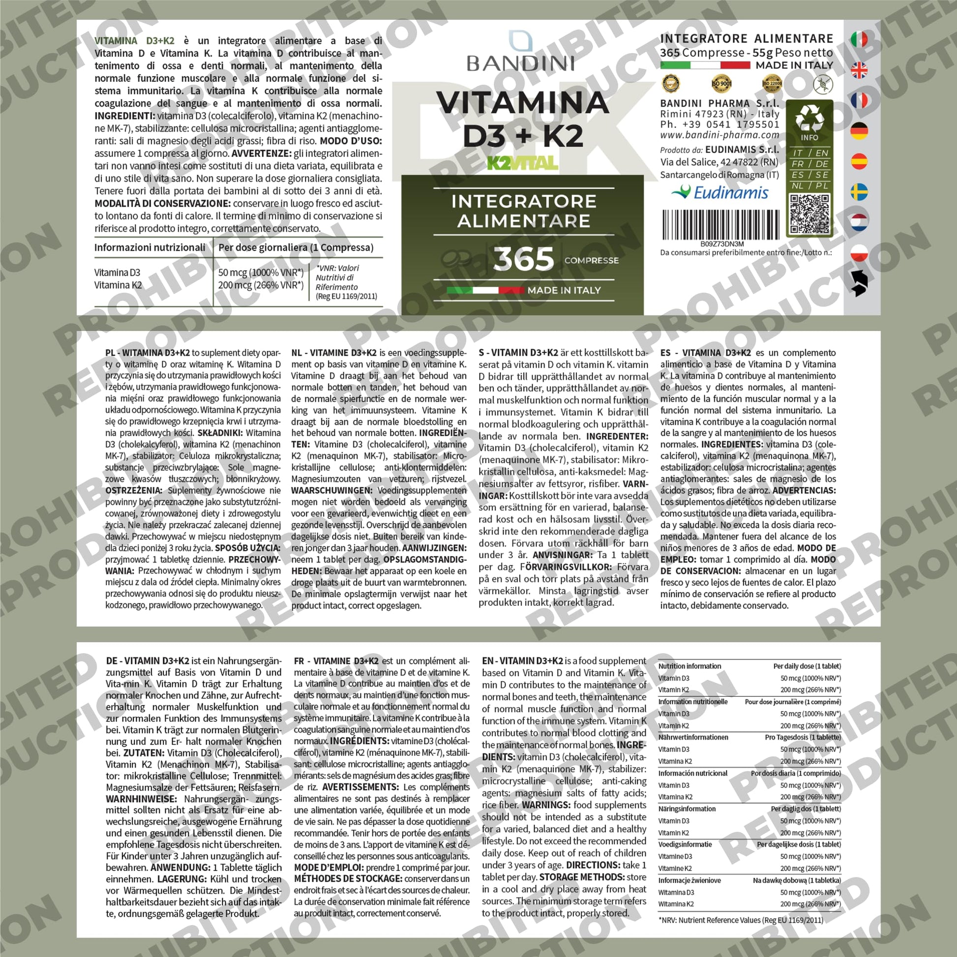 HIGH DOSAGE, GUARANTEED STOCK. High-dose food supplement with 50 mcg/μg of Vitamin K2 MK-7 and 2000 IU (200 mcg/μg) of Vitamin D per daily dose (1 micro-tablet). Practical pack of 365 tablets, a single pack has a coverage of 1 year. FUNCTIONALITY. Vitamin D contributes to maintaining adequate calcium metabolism, which is essential for bones and teeth, to maintaining the normal functioning of the immune system and the correct functioning of the muscles. Vitamin K contributes to normal blood clotting and the maintenance of normal bones and cartilage. Vitamin K2 MK-7 Menaquinone-7 is the most bioavailable form of vitamin K2. HOW TO USE. Take 1 tablet per day with water or other drink of your choice. One a day is enough to meet the needs of an adult. Our very small tablets have a diameter of only 6 mm, are easy to swallow and easily swallowed. TESTED QUALITY. Vitamin D3 + K2 was created by careful selection of raw materials. We use the premium ingredient with very high standards K2VITAL, Vitamin K2 MK7 all-trans 99.7%. Vitamin D3 (cholecalciferol) is derived from natural lanolin with particularly high stability. Our product is naturally GMO-free, soy-free, flavor-free and colorant-free. CERTIFIED PRODUCT. Bandini Pharma is an Italian company capable of offering innovative and quality products for the health and well-being of people, in a dynamic and professional way: our products are made in our GMP, UNI EN ISO 9001:2015 and ISO certified laboratory 22000. The Bandini Pharma line, entirely made in Italy, includes a wide range of products with an excellent quality-price ratioMore Info