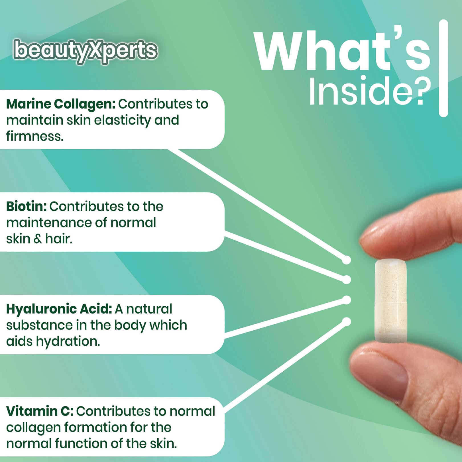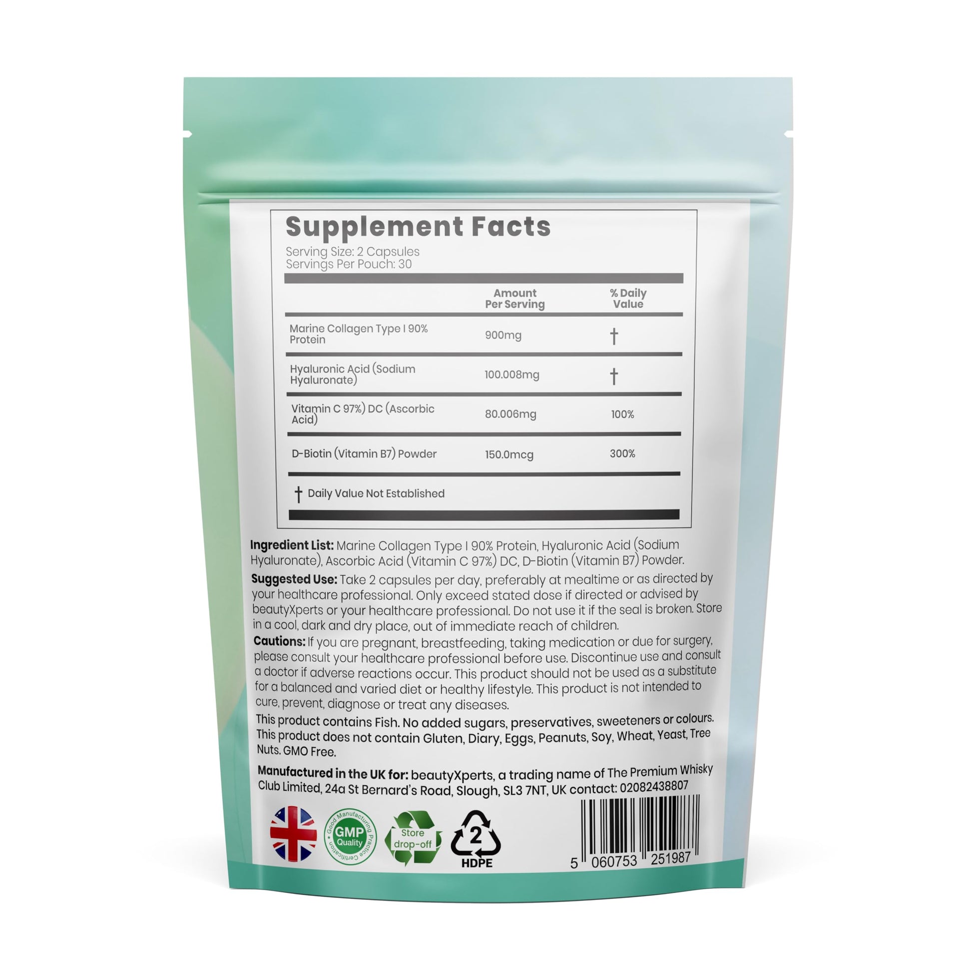 ★ HIGH STRENGTH MARINE COLLAGEN: Collagen is the most abundant protein in the human body, it is present in the bones, muscles, skin, and tendons. As we age, natural production starts to slow, making Collagen Supplements very popular.★ WITH BIOTIN, HYALURONIC ACID & VITAMIN C: Each serving (2 capsules daily) contains 900mg Of Marine Collagen, 100mg Of Hyaluronic Acid, 80mg Of Vitamin C, 150mcg Of Biotin. Collagen helps our body to maintain skin elasticity and firmness. Biotin can help contribute to the maintenance of normal skin & hair while hyaluronic Acid A natural substance in the body which aids hydration. Vitamin C also contributes to normal collagen formation for the normal function of the skin.