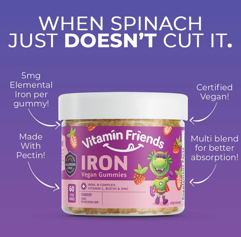 15mg Iron (Ferrous Fumarate) = 5mg Elemental Iron per gummy! Supports Body Function and Good Health* A lack of iron in the blood can lead to iron deficiency anemia (IDA). This condition is especially prevalent during the infant and adolescent years. A proper level of iron in the blood helps to ensure proper body function as well as good health in general during these ‘rapid growth’ periods. Iron Gummy Bear may increase the iron content in your body. These bears contain an essential mineral called ferrous fumarate and may help to prevent the drop of iron level in the blood. This ferrous fumarate supplement increases the hemoglobin level in red blood cells while also supporting hemoglobin formation. It may also promotes muscle health and strengthens the immune system. These gluten free dietary supplements also may help build concentration and memory power in young people and professionals. Get this Iron-Bear dietary supplement and protect your body from iron deficiency. More about the product SUPPORTS BODY FUNCTION & GOOD HEALTH: A healthy level of iron in blood leads to proper body function + promotes muscle health + strengthens immune system + helps build concentration + memory power + essential for healthy red blood cell formulation. GELATIN FREE INGREDIENTS THAT WON’T LEAD TO CAVITIES: Vitamin Friends is a gelatin free, non-sticky, high quality gummy vitamin, made with 100% natural Pectin. Unlike most other gummy products for kids, full of sugars & sticky gelatins PREMIUM INGREDIENTS: With a new delicious strawberry flavor.More Info