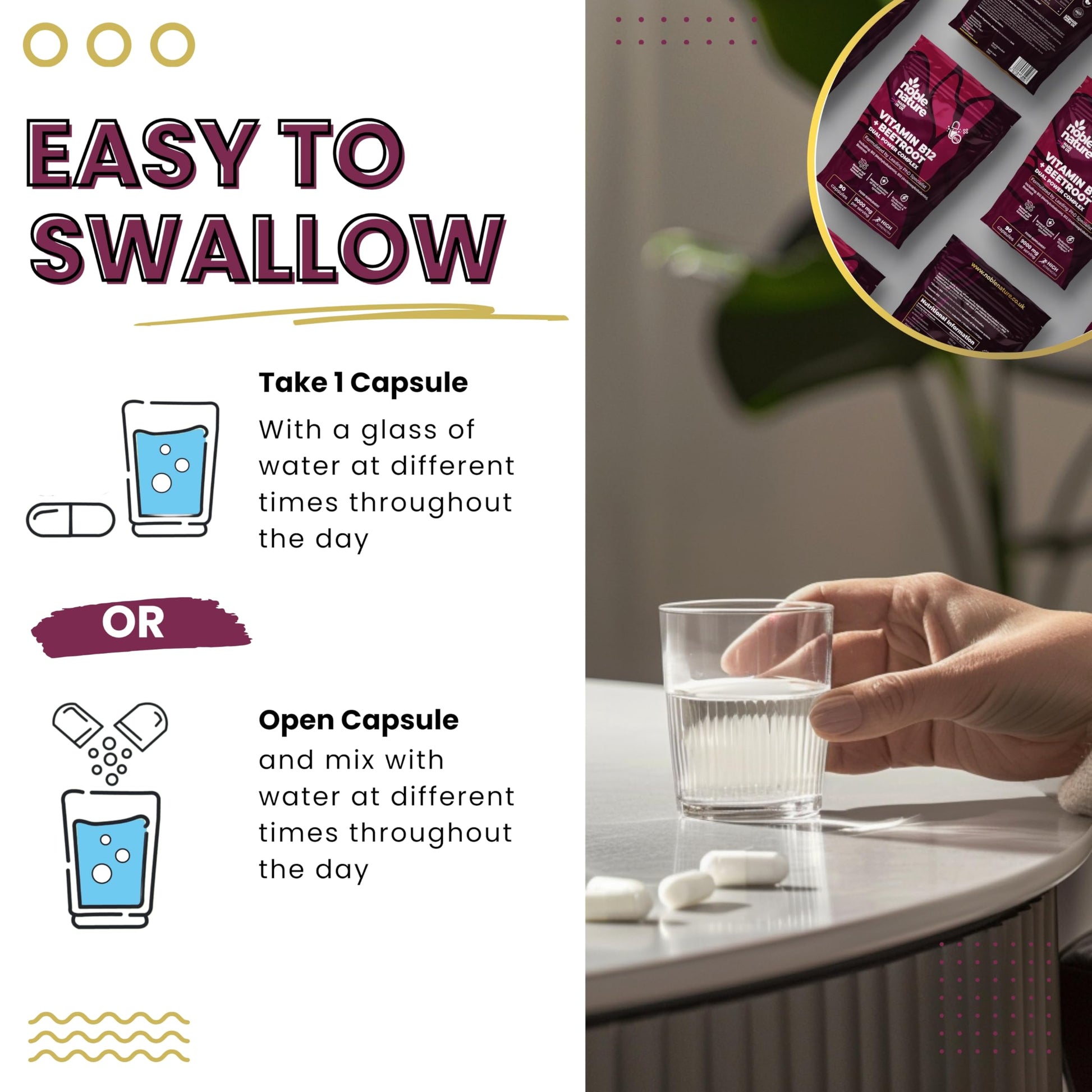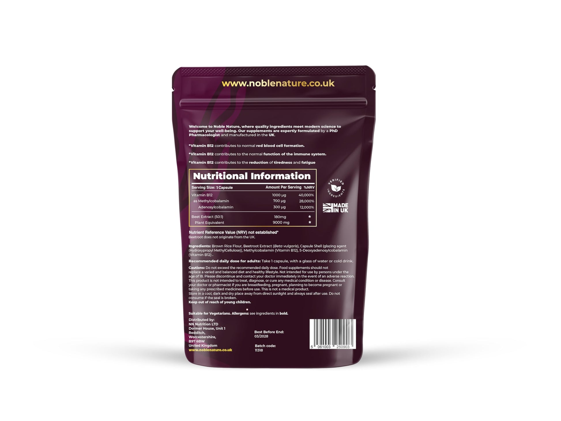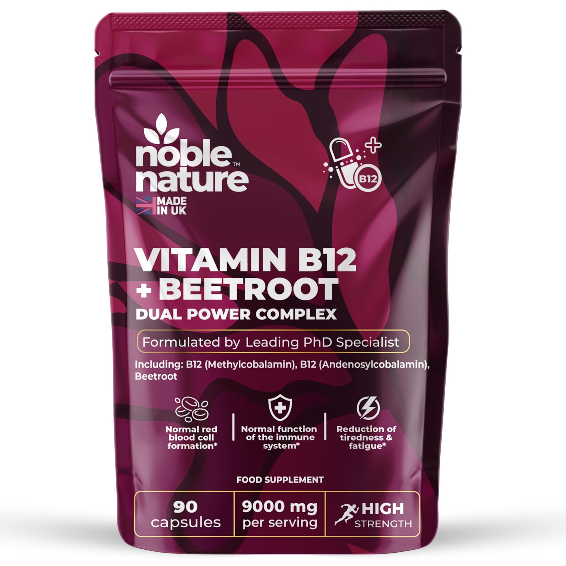 Support your energy, immunity, and overall wellbeing with NobleNature's Beetroot & Vitamin B12 Complex. Each capsule is packed with 9000mg of beetroot and 1000mcg of dual-action Vitamin B12, combining methylcobalamin and adenosylcobalamin—the two most bioactive and absorbable forms of B12. Vitamin B12 plays a key role in reducing tiredness and fatigue, supporting immune health, red blood cell formation, and cognitive performance. It also contributes to homocysteine metabolism, cell division, and nervous system function—making it a powerful nutrient for daily health. Beetroot is a nutrient-rich known for its complementary wellness benefits. Together, this unique combination provides comprehensive support for active lifestyles and daily vitality. Noble Nature supplements are proudly made in the UK in a BRCGS Standard facility and developed by a team including a PhD pharmacologist and SENr nutritionist. Every batch is crafted with care, integrity, and science-backed precision.More Info