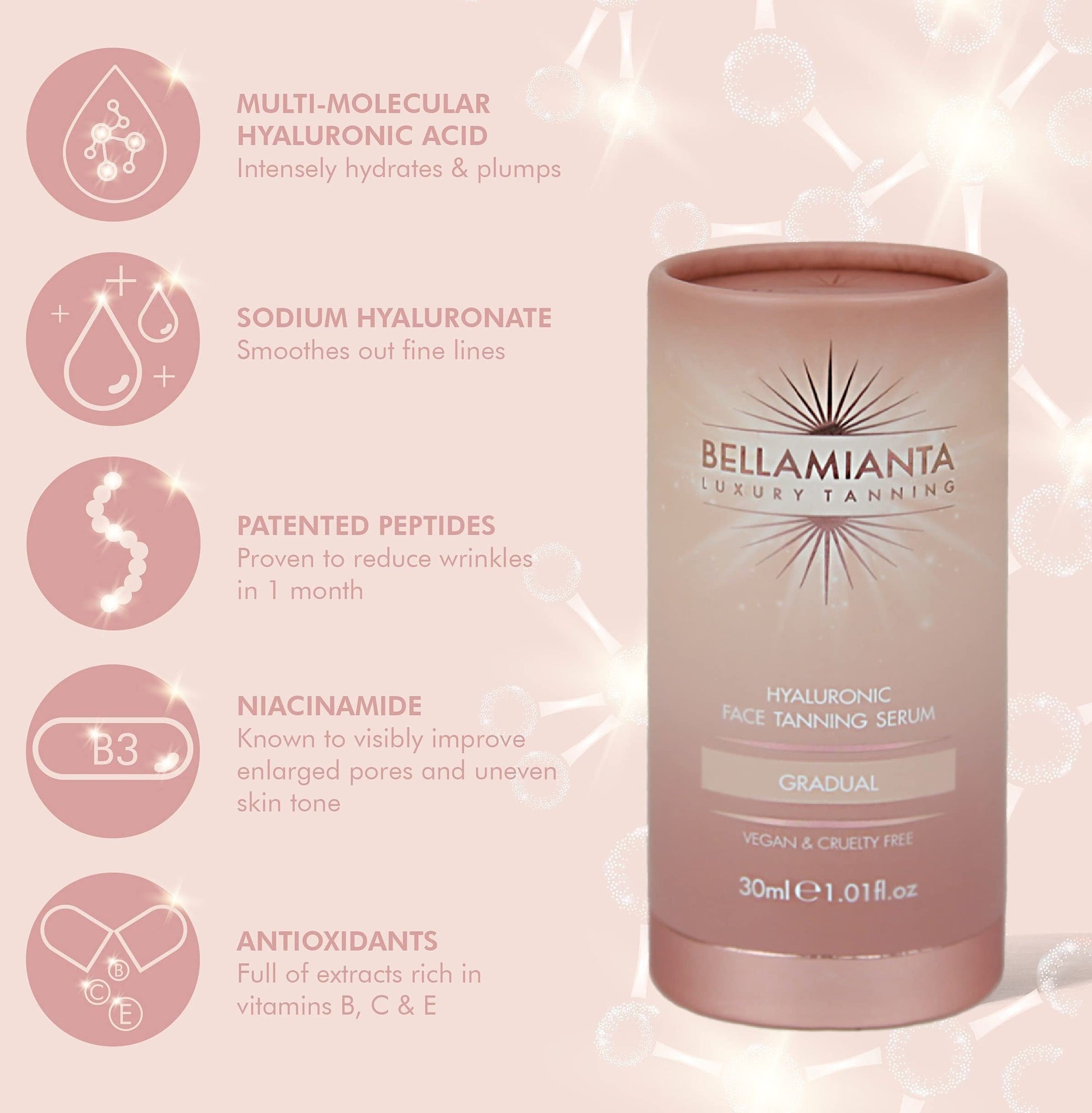 - TANNING FUSED WITH SKINCARE: Bellamianta's gradual tan moisturiser serum is specially formulated with patented peptides and proven ingredients that are designed to nourish and enhance your skins natural radiance whilst providing a natural, buildable face tanner.