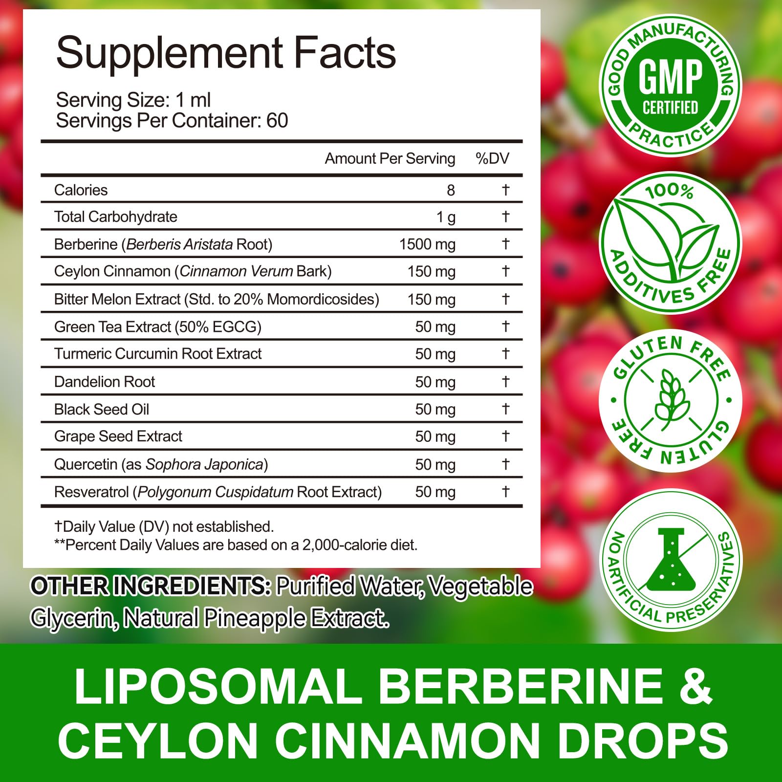 Berberine in Liquid Drops is a powerful, easy-to-use supplement designed to support your overall wellness. Infused with Ceylon Cinnamon, Bitter Melon, and Berberine, all in a convenient liquid form for maximum absorption..SUGGESTED USE: