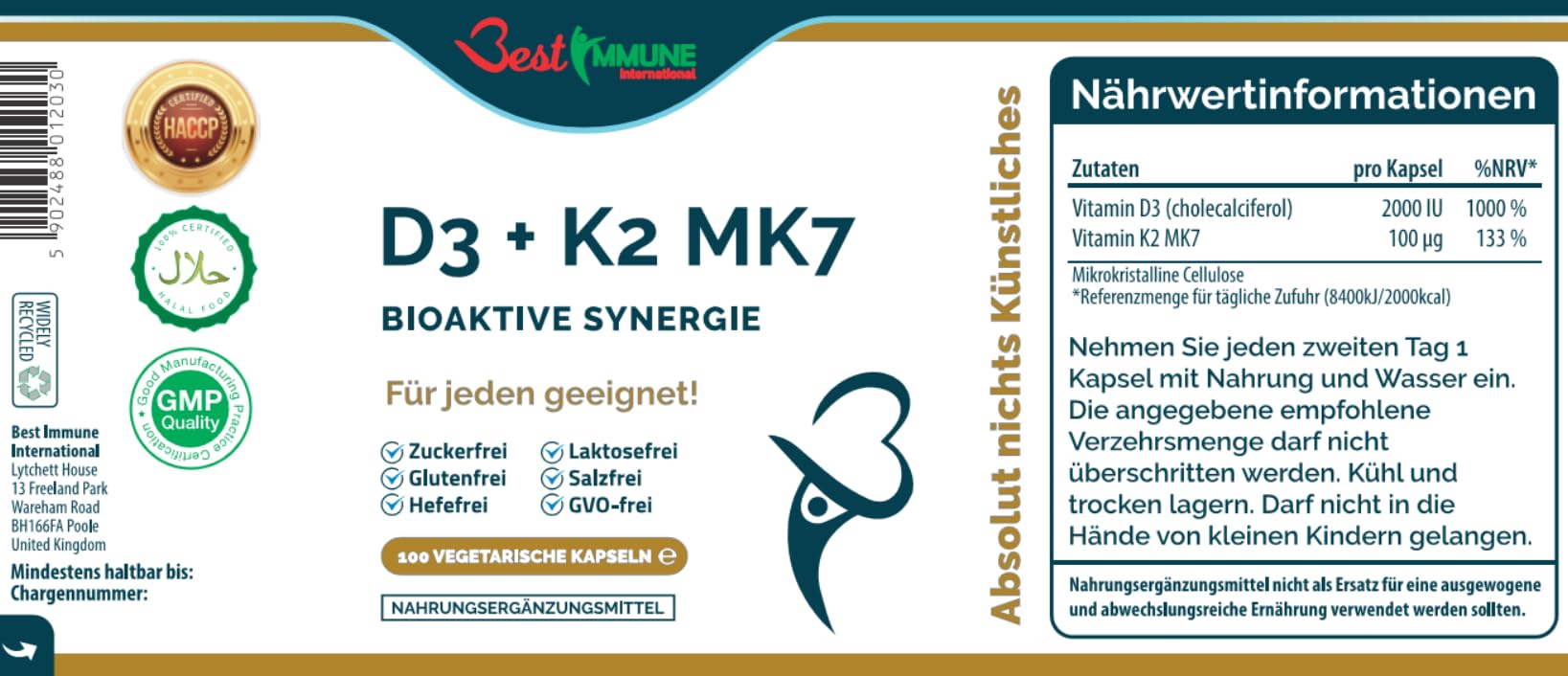 Best Immune International Vitamin D3 2000IU K2 MK7 100mcg Natural Premium Quality 100 Capsules Immune Support Perfect Proportions Maximum Absorption