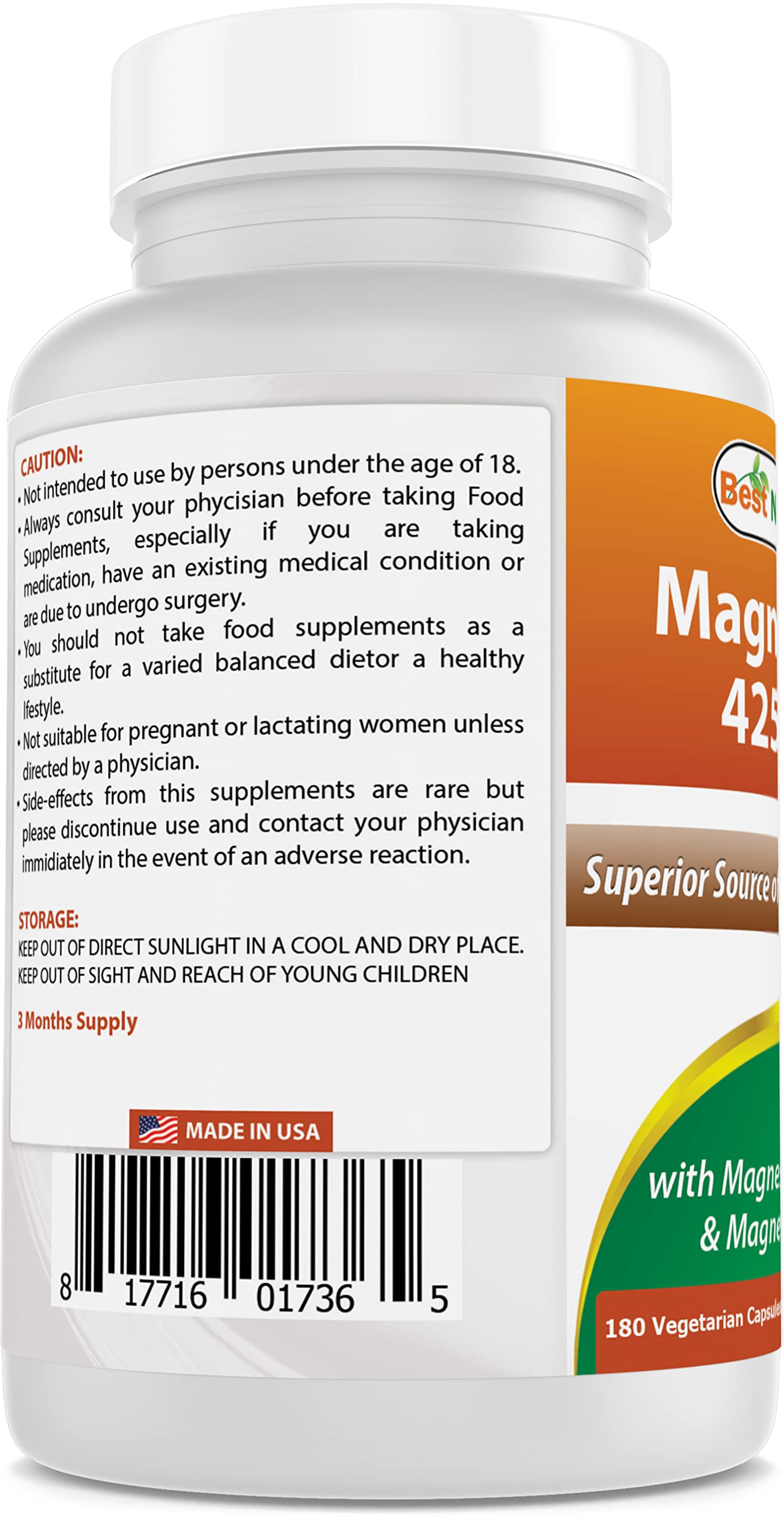 Best Naturals Magnesium 425 mg 180 Veggie Capsules - High Absorption Magnesium Glycinate & Magnesium Oxide Chelated, Non-GMO, Gluten Free Muscle Relax (180 Count (Pack of 2))