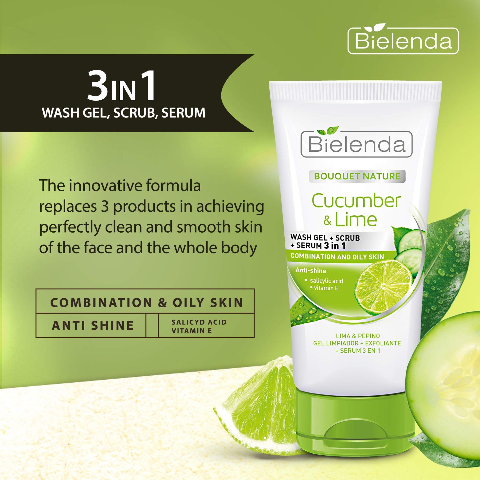 Bielenda BOUQUET NATURE - Replaces 3 Products In Achieving Perfectly Clean And Smooth Skin Of The Face And The Whole Body - Cucumber And Lime Gel+Scrub+Serum 3In1-150 g